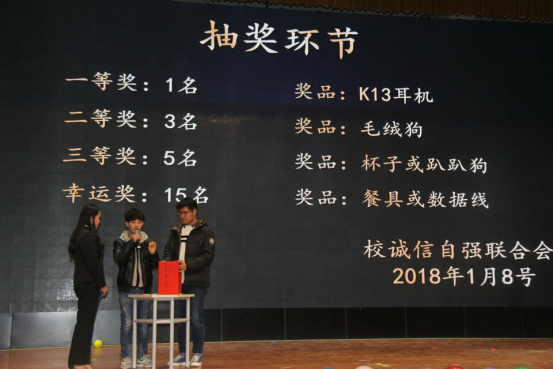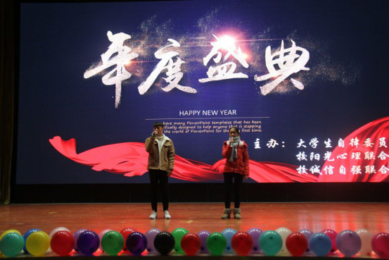 寒冷冬日,热情似火。为增强社团之间的友谊,加强交流与合作,校阳光心理联合会、诚信自强联合会和大学生自律委员会于2018年1月8日晚7点,在大学生活动中心举办了联谊晚会。在老师的支持下,经过各方同学们的努力筹备,近四个小时的联谊晚会获得圆满成功。