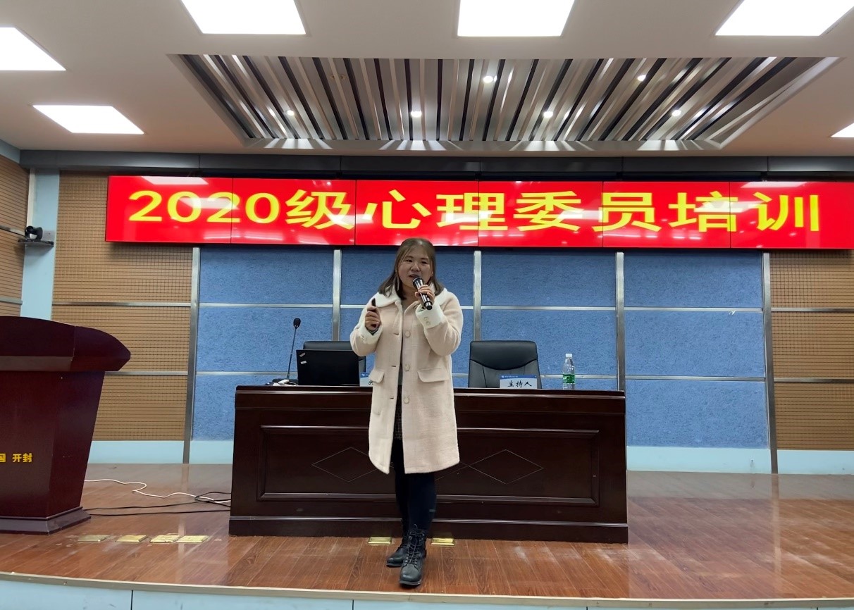 为进一步加强我校心理健康教育工作,深入落实心理危机干预“校-院-班级-宿舍”四级网络体系,充分发挥班级心理委员在学校心理健康教育工作中的作用,11月28日,我校特邀开封市第五人民医院中级心理治疗师吴倩和河南大学民生学院专职心理咨询师张倩于三号实训楼三楼报告厅开展2020级心理委员培训。此次培训由我校心理健康教育中心主任刘娟主持,2020级各班心理委员、校阳光心理联合会和素质拓展队共300余名成员参加培训。