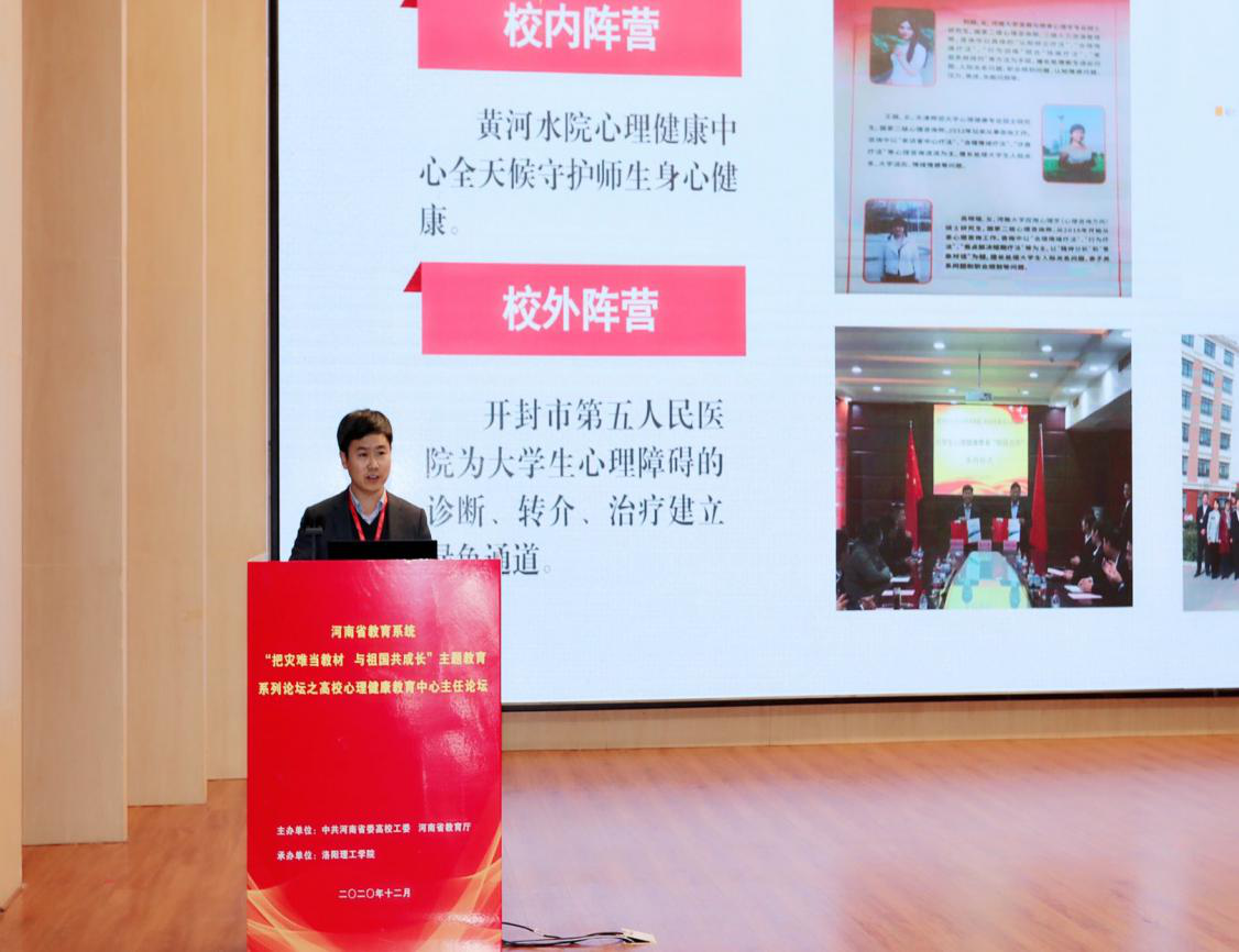 大爱无疆,盛世长宁。在万众瞩目的“十四五”新蓝图和2035远景目标提出之际,由中共河南省委高校工委、河南省教育厅主办,洛阳理工学院承办的河南省教育系统“把灾难当教材 与祖国共成长”主题教育系列论坛之高校心理健康教育中心主任论坛于12月16日下午在洛阳理工学院拉开序幕,本次论坛历时三天,主要包括经验交流、参观考察和心理素质拓展等三部分内容。河南省教育厅督学贾正国、思政处副处长徐军保,洛阳理工学院党委书记陈岩、党委副书记兼工会主席曾涛、副校长胡恩立出席了开幕式,开幕式由徐军保主持。来自全省132所高校的心理健康教育中心主任参加论坛,我校学生工作部(处)部(处)长、心理健康教育中心主任刘许亮,心理健康教育科科长刘娟参加论坛。