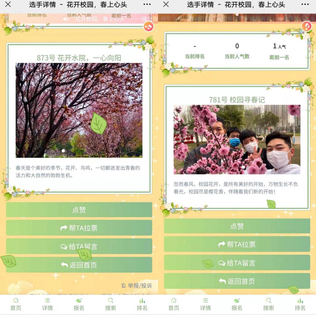 活动中,同学们通过手机、相机等捕捉光与影的瞬间,记录校园的春天,定格生活的点滴,用美丽的心灵、细腻的镜头、独特的视角,感悟生命之美,共绘多彩生活。此次大赛采用双校联动、线上投票的形式,共计1500余名学生参与,累计访问人次超22万,累计点赞量超230万。参赛作品主要围绕春天、希望、梦想、幸福等主题,包含人物、动植物、校园风景等内容,充分展现了同学们热爱生活、热爱校园、热爱生命的精神风貌。