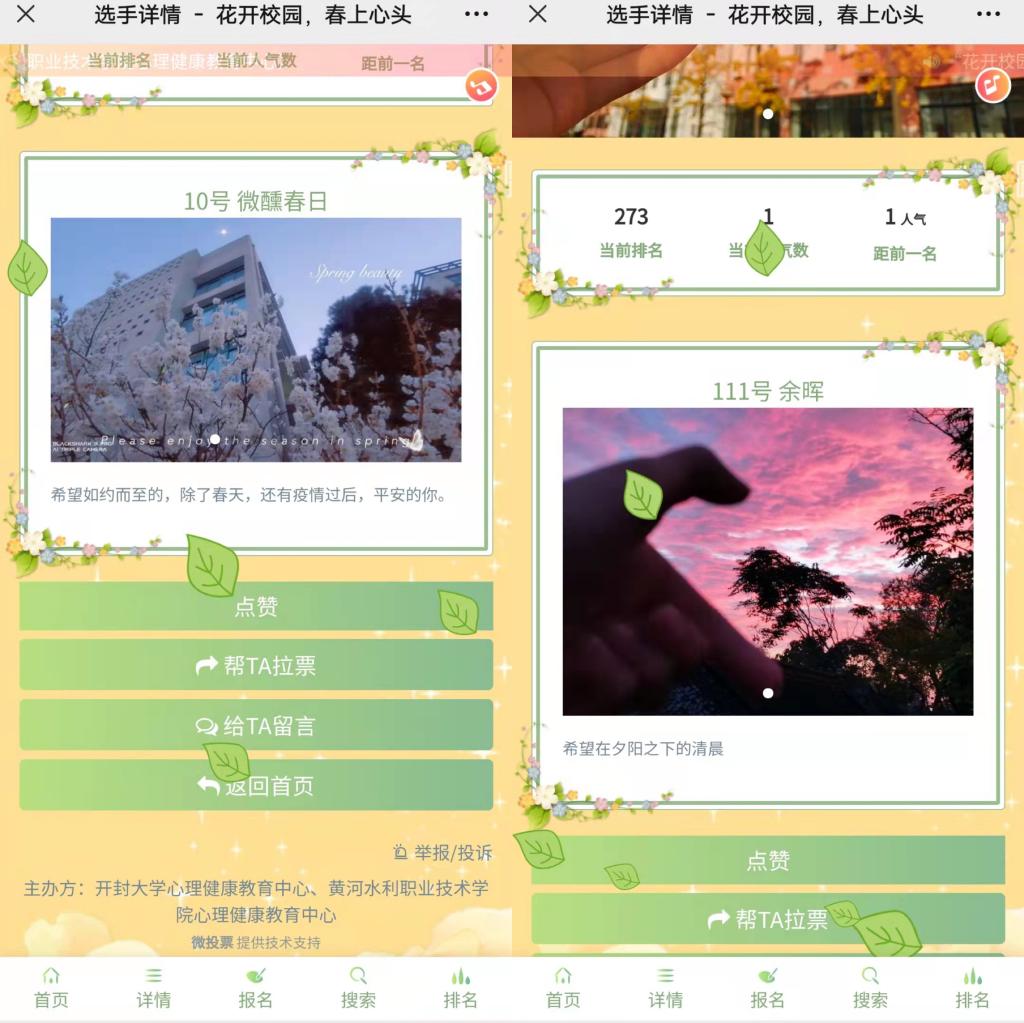 春至水院,春华灿烂。为丰富广大学生的校园文化生活,培养学生自尊自信、理性平和、积极向上的健康心态,3月21日至4月8日,我校心理健康教育中心与开封大学共同举办了以“花开校园,春上心头”为主题的向美心行摄影大赛。