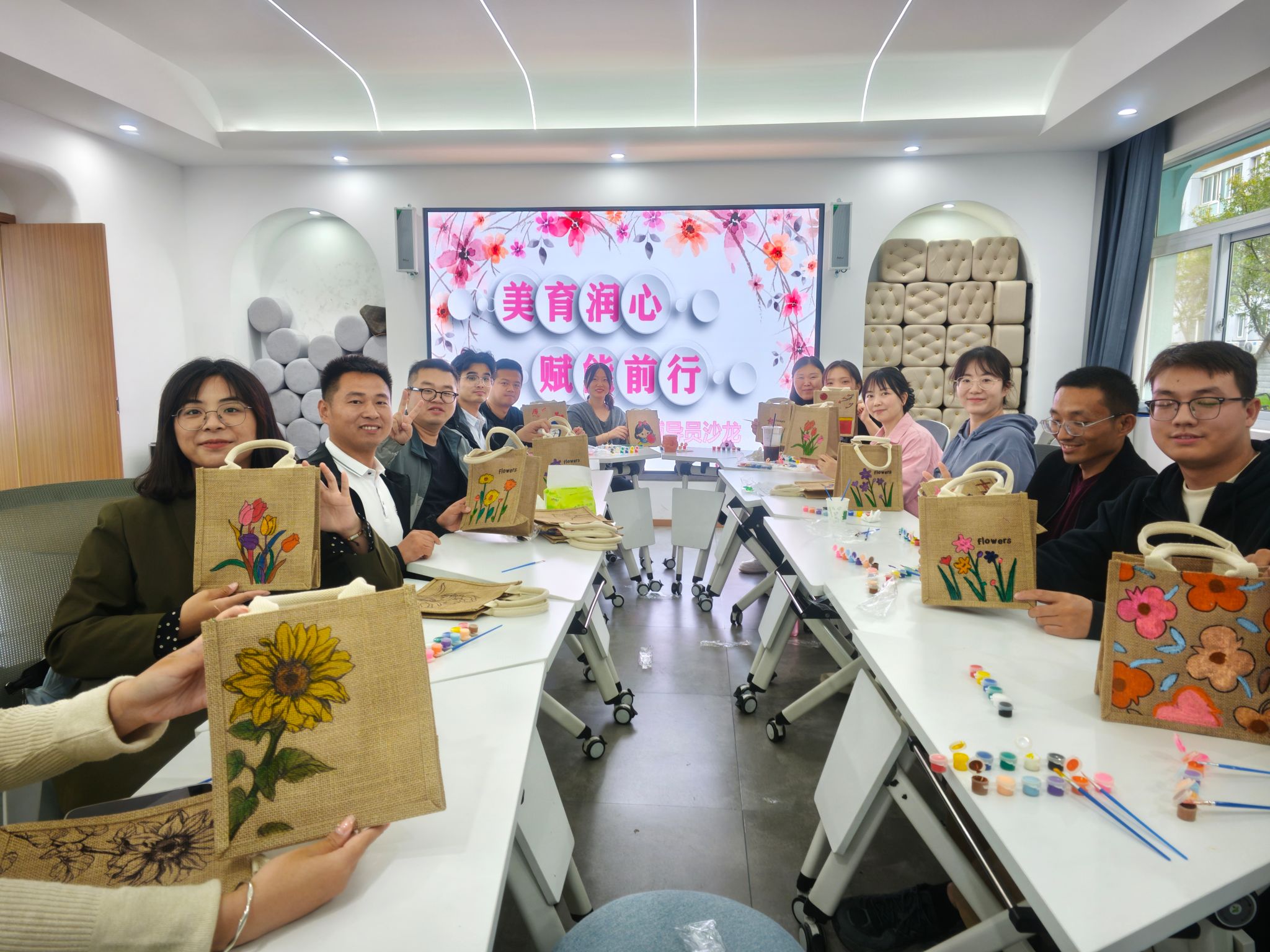 活动实践环节,辅导员们手持画笔,尽情挥洒想象,在帆布包上勾勒出最生动的笔触。随着色彩在帆布包上的充盈与交织,现场气氛逐渐升温,仿佛每一笔都蕴含着无尽的创意与情感,通过色彩与情感的碰撞,将内心世界展现得淋漓尽致。这些作品不仅成为了生活的点缀,更是情感的寄托,承载着老师们对美好生活的向往与追求。
