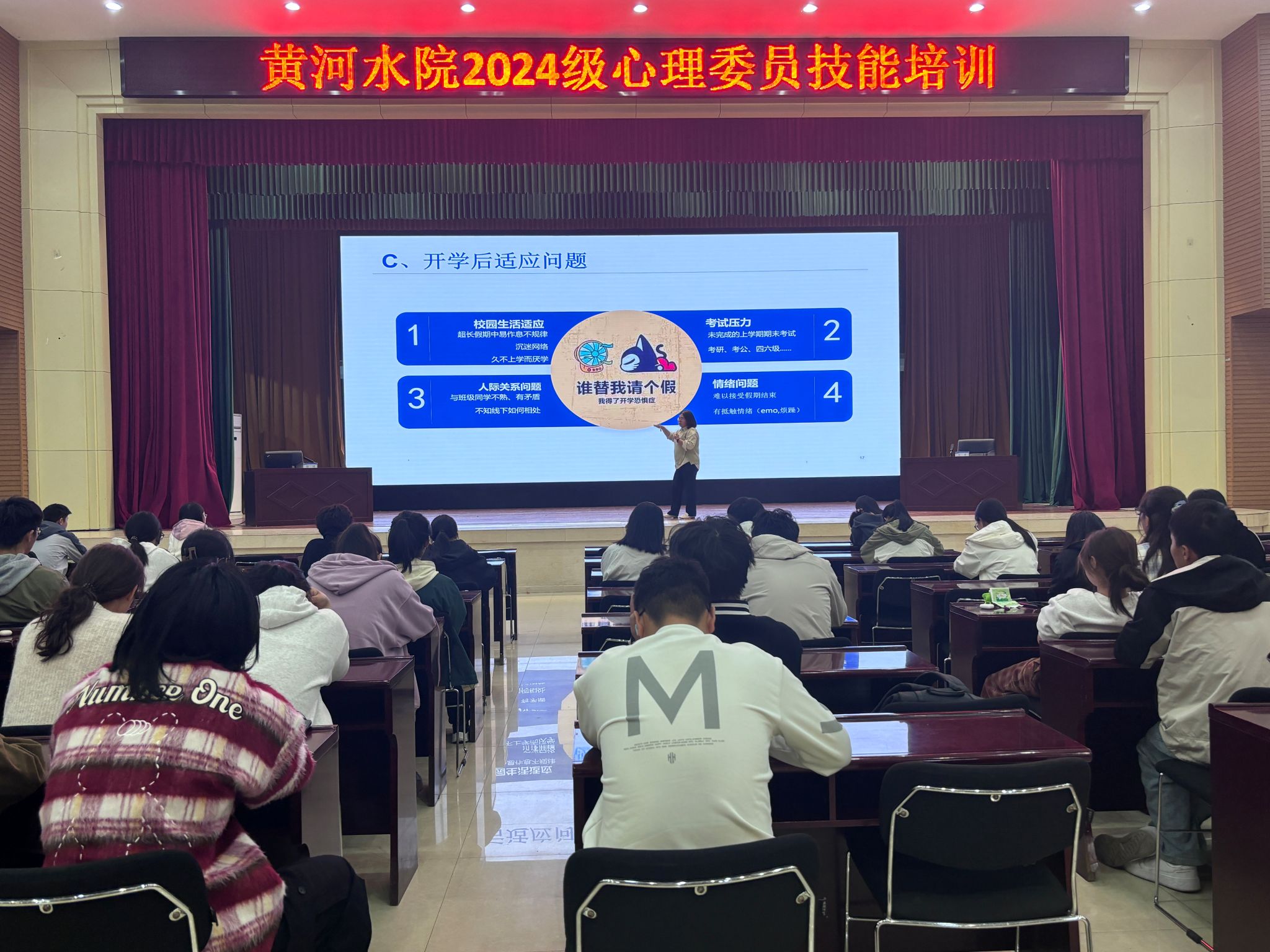 为进一步加强心理委员队伍建设,充分发挥班级心理委员的关键,提升我校心理危机干预水平,深化心理育人工作,学校特邀开封市文化职业旅游学院心理健康教育中心教师娄堃、河南开封科技传媒学院心理中心负责人张倩,于10月15日、10月19日上午在大学生活动中心举办两期心理委员专题培训,心理健康教育中心全体人员、2024级心理委员培训、校阳光心理联合会和素质拓展队共300余名成员参加培训。