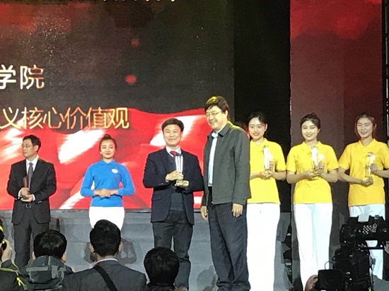 按照《中共河南省委高校工委 河南省教育厅关于组织开展首届普通高等学校校园文化建设优秀成果展演活动的通知》要求,我校高度重视、精心组织,认真开展遴选推荐工作,共推荐2项优秀校园文化建设成果候选项目。经专家评审,我校《加强典型选树培育和践行社会主义核心价值观》项目荣获一等奖,学生处处长刘许亮代表学校上台领奖。