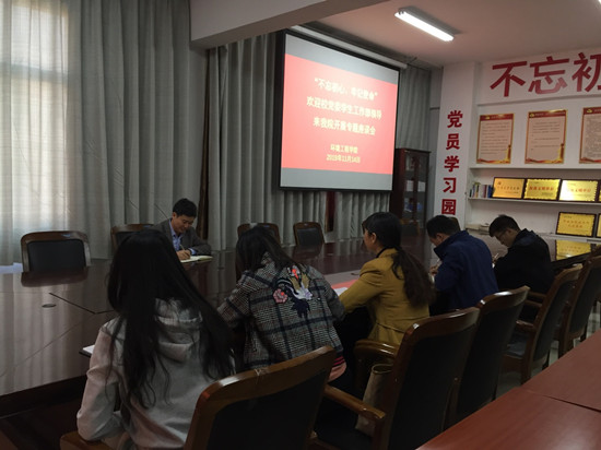 11月14日下午,学生工作部部长刘许亮到环境工程学院进行“不忘初心、牢记使命”主题教育辅导员工作专题调研,环境工程学院党总支副书记曾宝亭、副院长王振伟、分团委书记(辅导员)孙莉莉、辅导员马琳娜、王维宇参加了座谈会。
