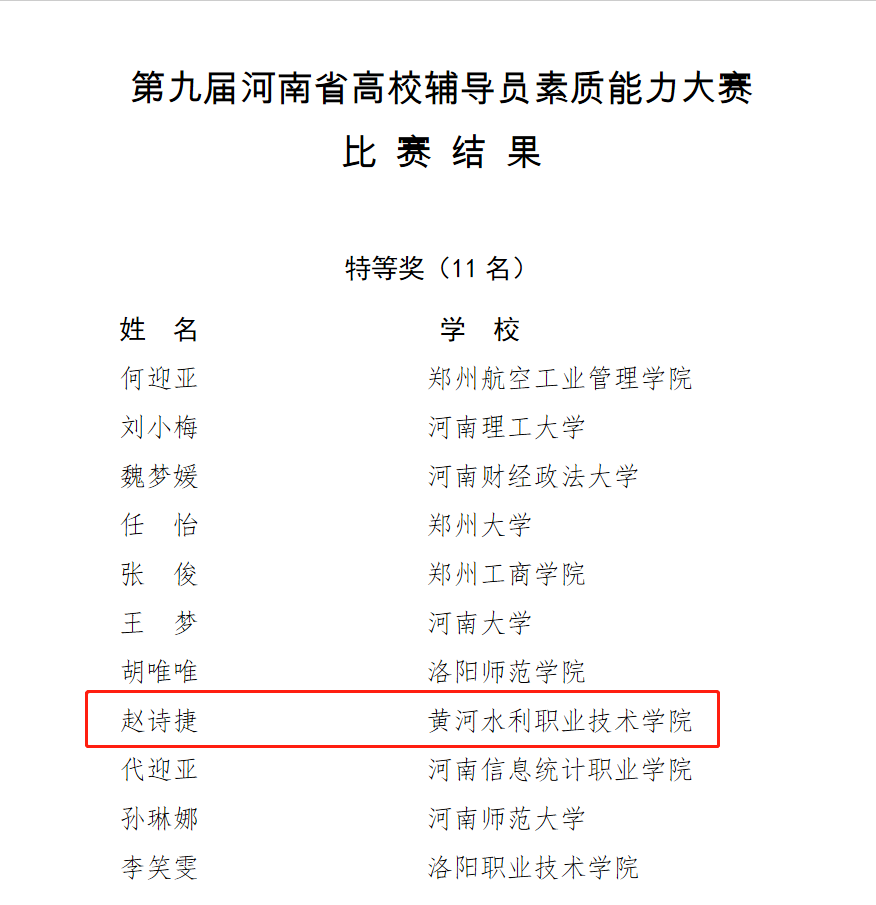 4月27日-5月11日,第九届河南省高校辅导员素质能力大赛在河南理工大学举行,来自全省130所高校的133名选手参赛。我校水利工程学院辅导员赵诗捷凭借昂扬的精神风貌、扎实的业务功底、缜密的逻辑思维、出色的语言表达及过硬的综合能力,一路过关斩将,最终荣获大赛特等奖,其优异成绩在全省高职院校中位列第一。