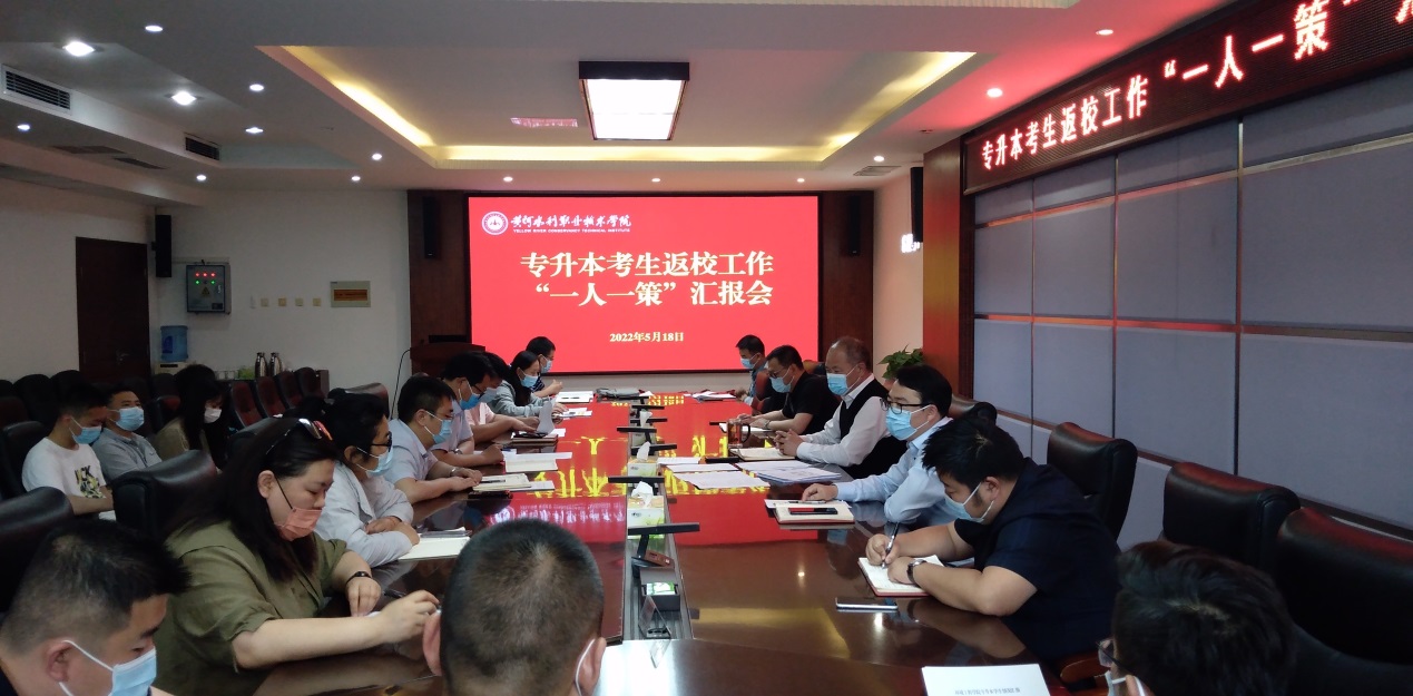 5月18日下午,学校在行政楼第一会议室召开专升本学生返校工作“一人一策”汇报会。校党委副书记、工会主席杨士恒,学生处和团委有关人员、各学院党总支副书记参加会议。
