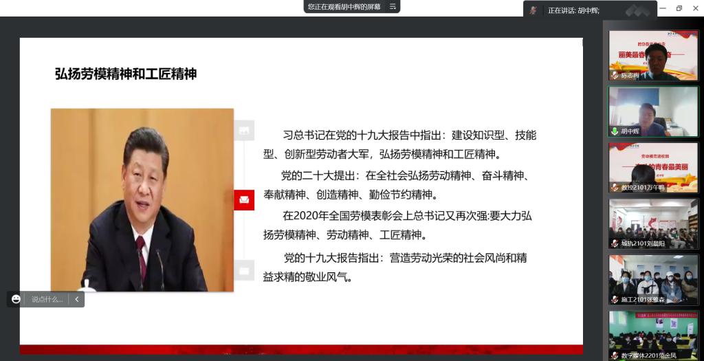为认真学习宣传贯彻党的二十大精神,大力弘扬劳模精神、工匠精神,用劳模精神、工匠精神引领广大学生成长成才,走技能成才、技能报国之路。11月26日上午,学生处组织开展线上专题讲座,特别邀请到团中央常委,全国劳动模范,全国五一劳动奖章获得者胡中辉作线上讲座。我校200余名学生参与观看了直播。