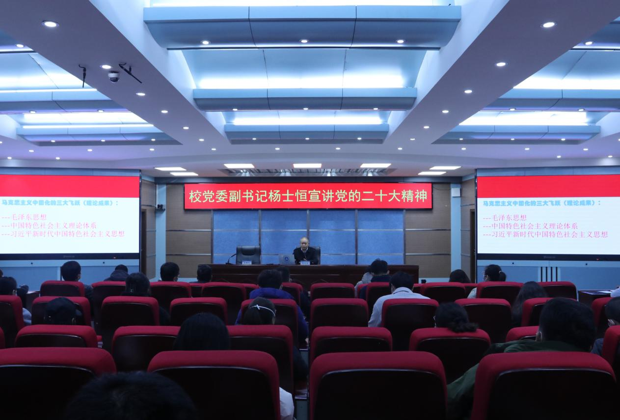 杨士恒紧扣党的二十大报告原文,围绕大会的主题、重要成果、精神实质和战略部署等方面,紧密结合学校教育改革发展实际,从“开辟马克思主义中国化时代化新境界”“以中国式现代化推进中华民族伟大复兴”“以党的二十大精神为指引,全力全方位做好学生工作”三个方面,深入阐释了党的二十大精神。指出党的二十大是在全党全国各族人民迈上全面建设社会主义现代化国家新征程、向第二个百年奋斗目标进军的关键时刻召开的一次十分重要的大会。大会通过的报告,从三件大事、十六个方面的伟大成就,总结了过去五年的工作和新时代十年的伟大变革,明确宣示了我们党在新时代征程上举什么旗、走什么路、以什么样的精神状态、朝着什么样的目标奋勇前进。
