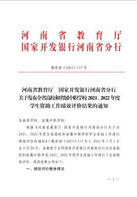 近日,河南省教育厅 国家开发银行河南省分行下发《关于发布全省高校和省属中职学校2021、2022年度学生资助工作绩效评价结果的通知》(教资助〔2023〕157号),我校获评全省高校2021、2022年度高校学生资助工作绩效评价“优秀”等级。