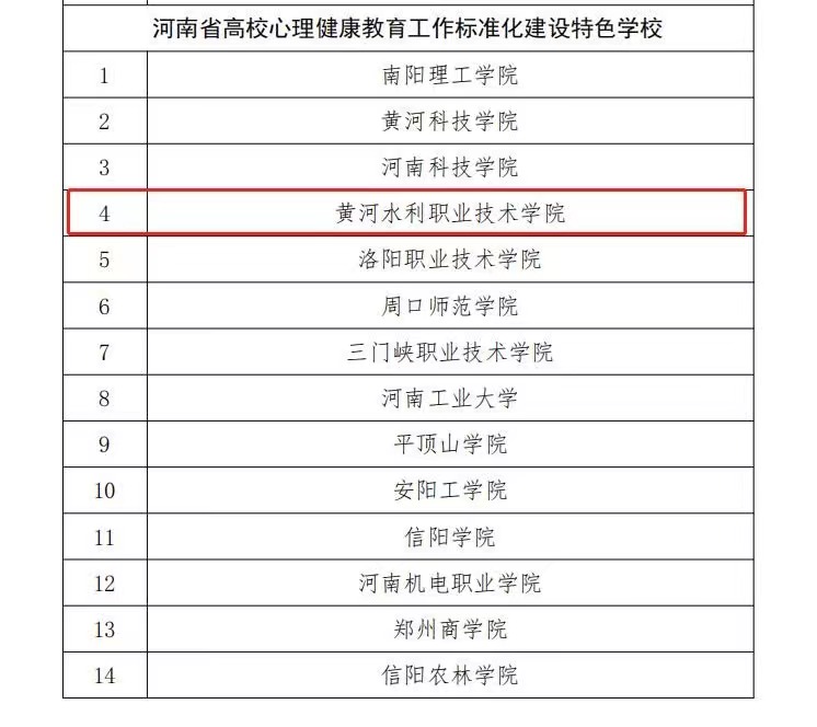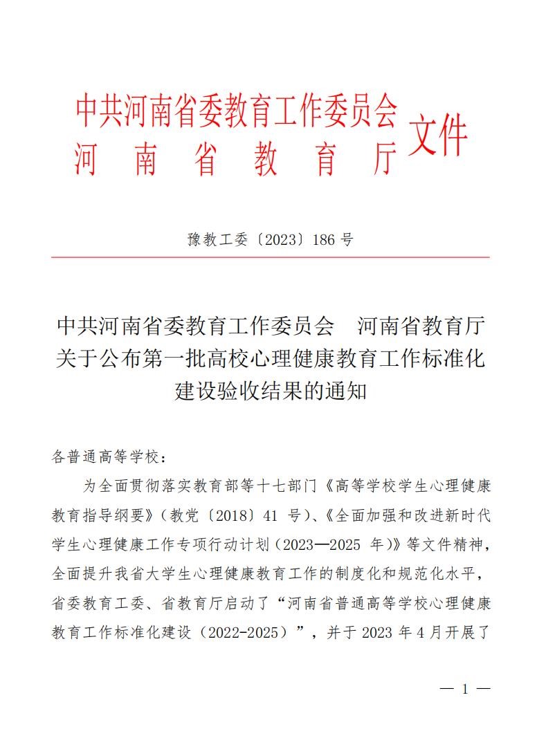 近日,中共河南省委教育工作委员会、河南省教育厅下发了《关于公布第一批高校心理健康教育工作标准化建设验收结果的通知》(豫教工委〔2023〕186号),我校顺利通过此次验收并被评选为河南省高校心理健康教育工作标准化建设特色学校。