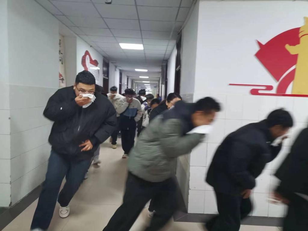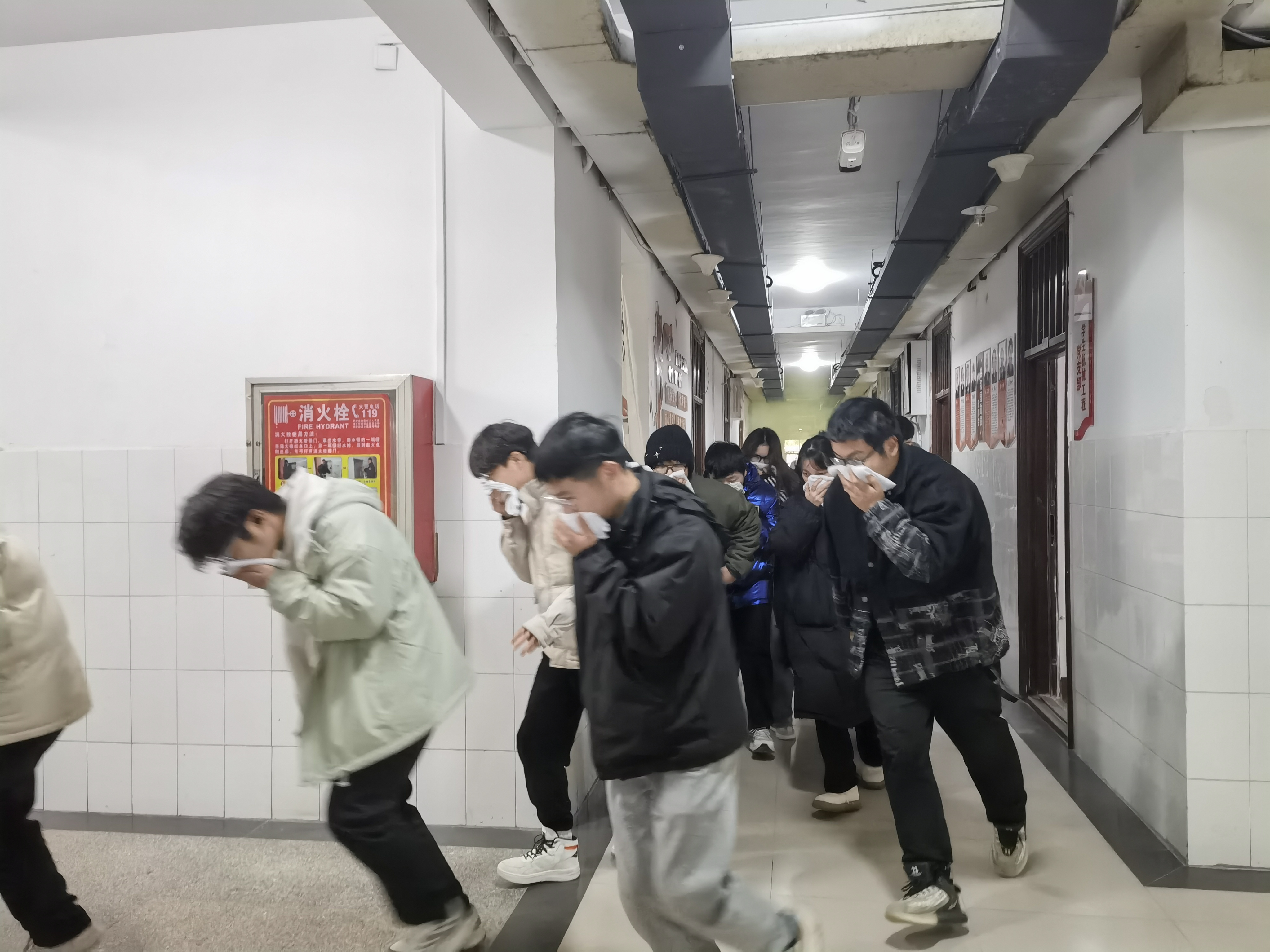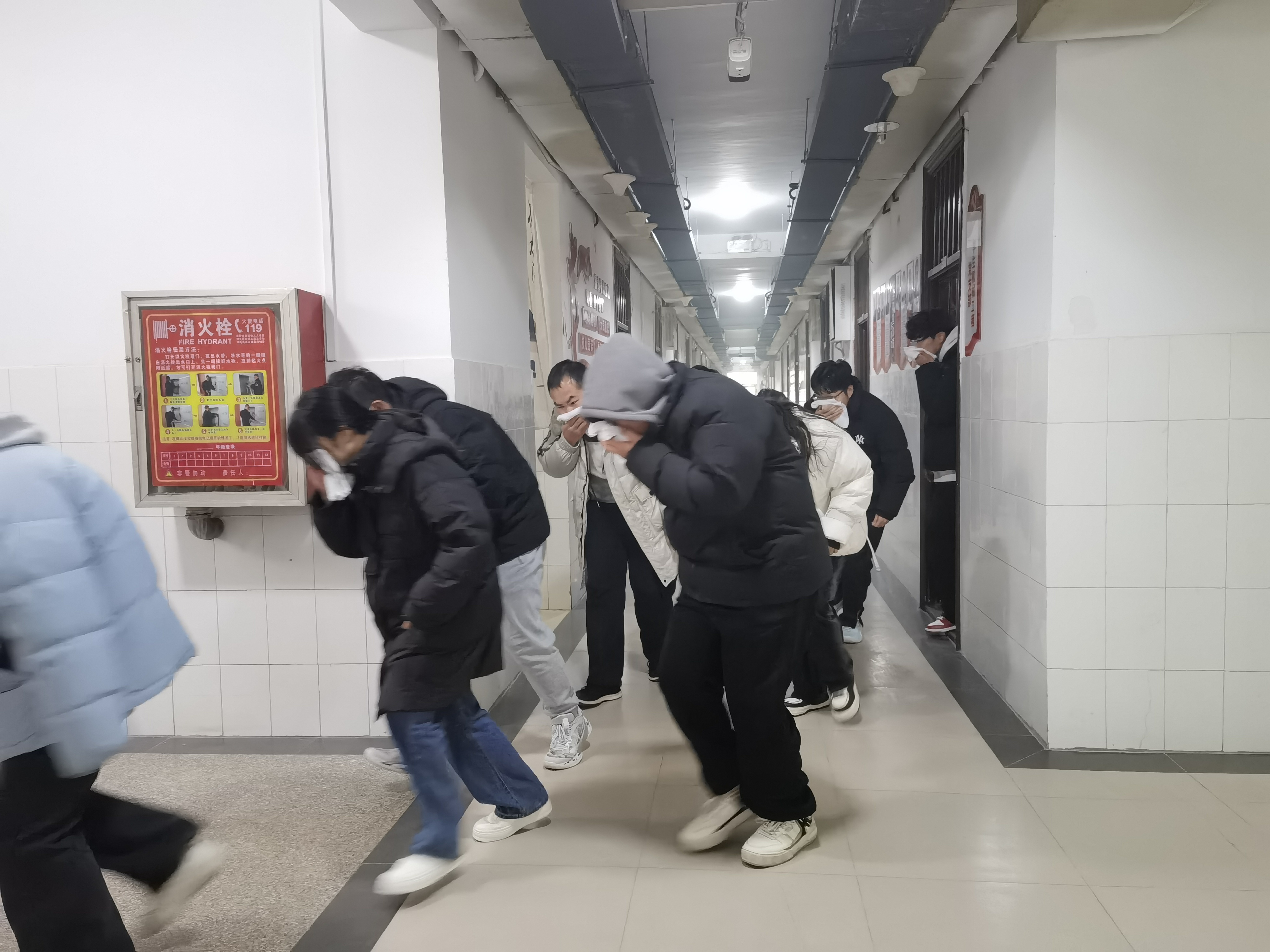 灭火器使用演练后,演练人员进入5号公寓楼模拟疏散逃生,在烟雾弹的烟雾中,楼管员第一时间进行全楼断电、打开逃生门,并拨打了火警电话和校内报警电话,同学们迅速反应,用毛巾捂住口鼻,俯身有序撤离,迅速转移到安全地带。