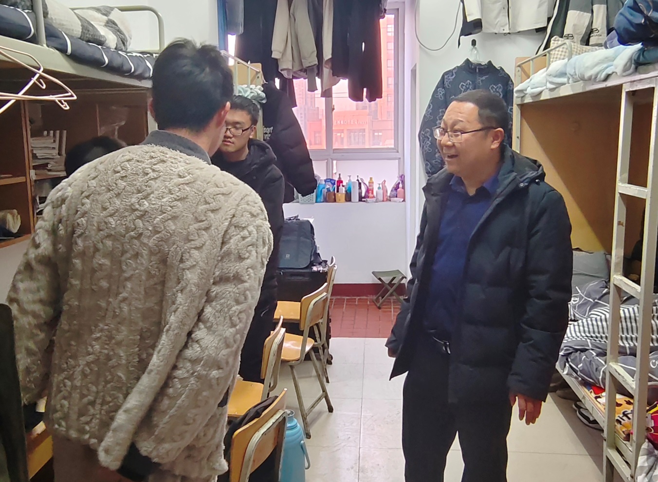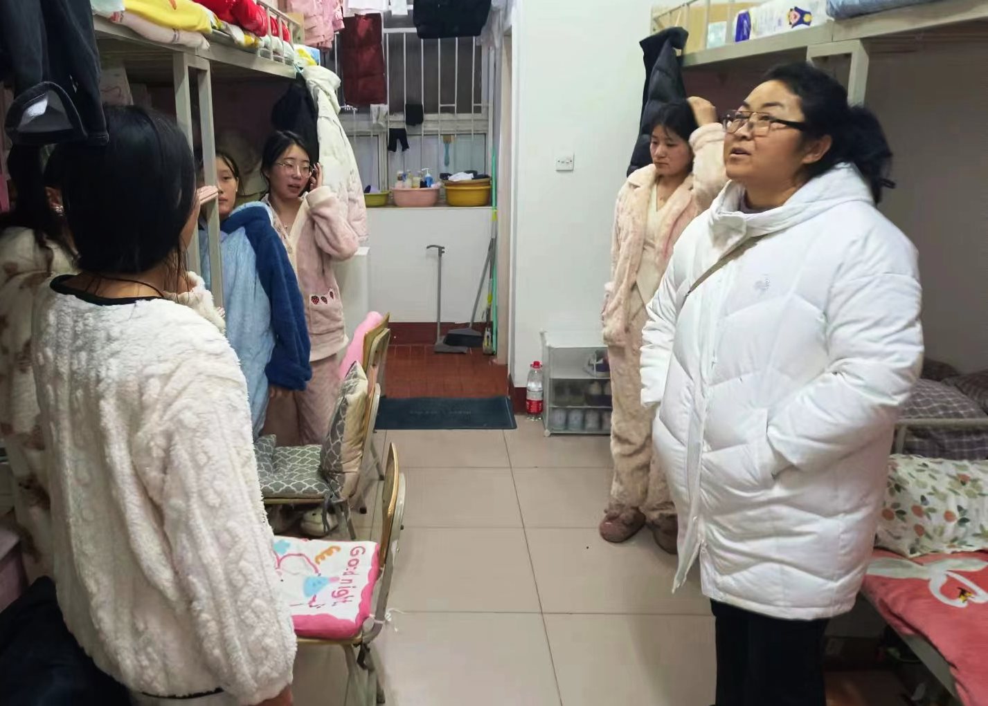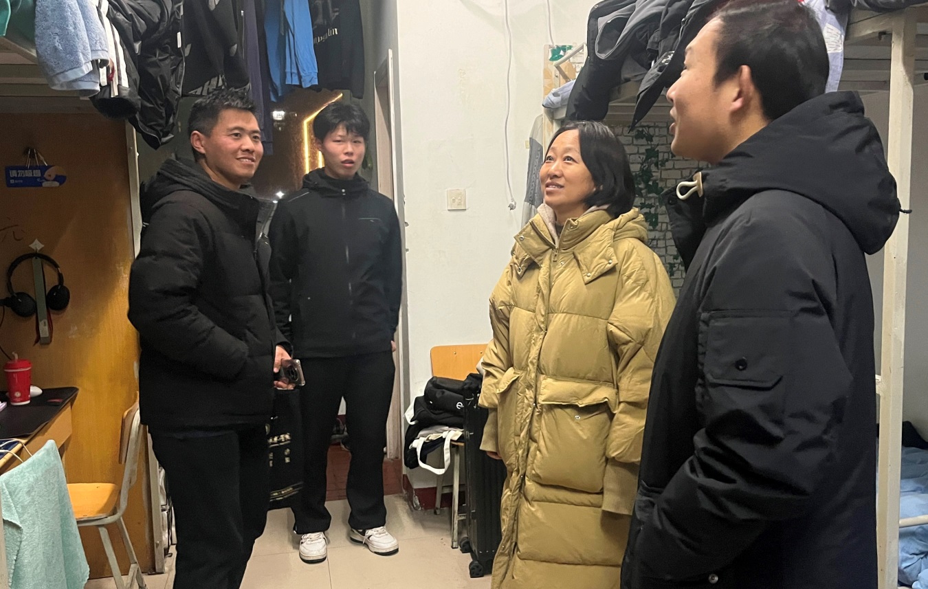 随后,周保平随机走访部分学生宿舍,开展实地安全检查,深入了解同学们学习生活和思想动态。在宿舍里,她细心地摸摸同学们的被褥是否厚实,看看宿舍里的空调能否正常工作,温暖地提醒同学们数九寒冬,要加衣加被,注意保暖。每到一个宿舍,她都与学生亲切交谈,了解学生在校的学习生活情况,提醒同学们注意冬季用电安全,确保平安过冬。她希望同学们要养成良好的学习、生活习惯,积极营造整洁高雅、健康文明、安全有序的宿舍环境。她嘱咐同学们在学习或生活方面遇到困难时,一定要及时给老师反映,学校一定会尽全力为大家提供支持。