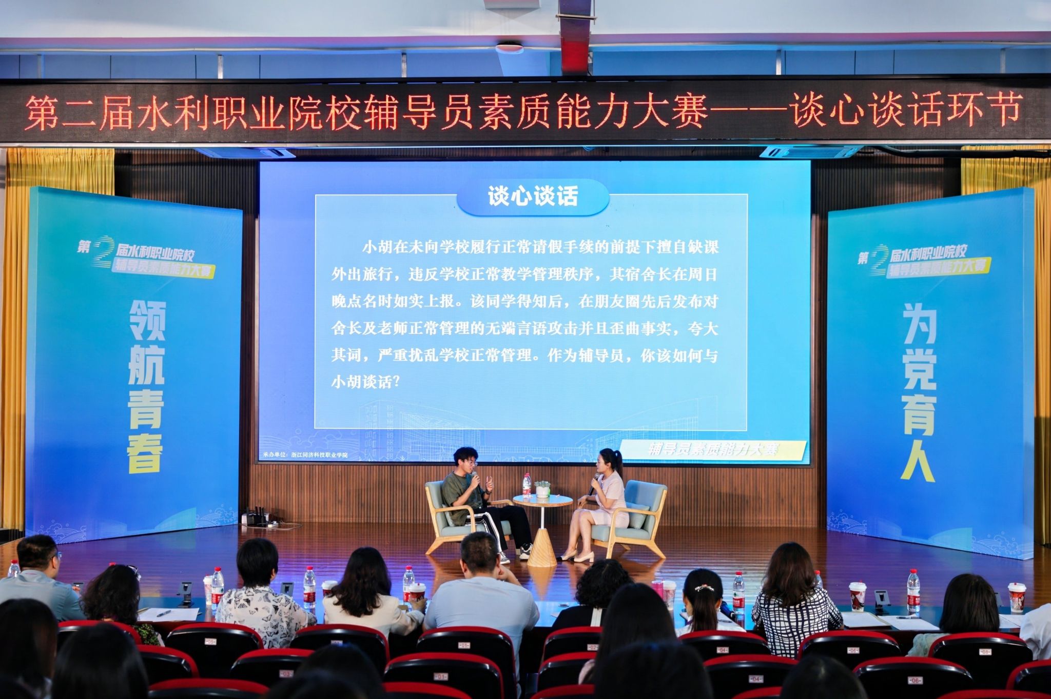比赛设置基础知识测试、案例研讨和谈心谈话三个环节,结合辅导员日常工作经验和理论学习成果,多角度、深层次考核辅导员的业务能力和知识储备,全面考察辅导员的理论功底、业务水平和文化素养。