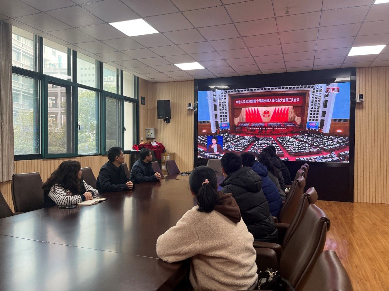 3月5日,学生工作部全体教职工在会议室JX5111集中收看十四届全国人大三次会议开幕会。