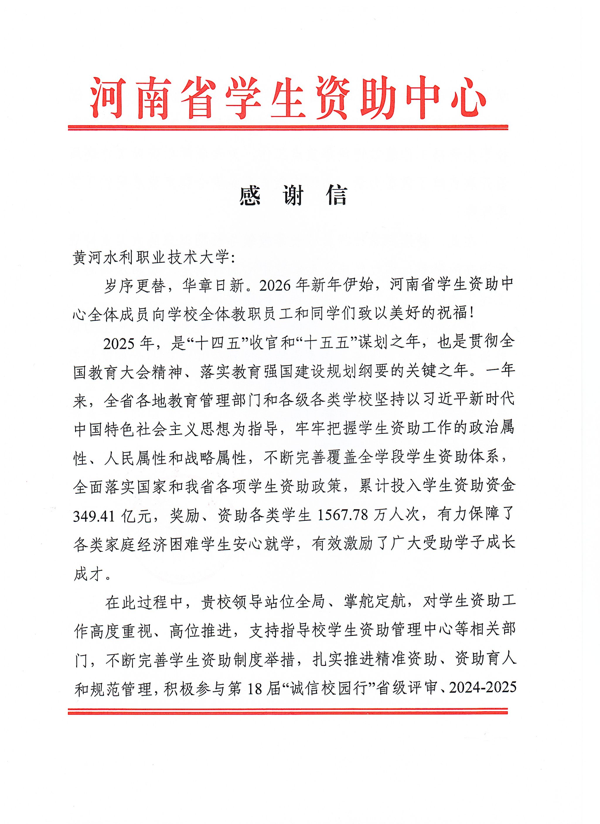 近日,河南省学生资助中心向我校发来感谢信。信中,省资助中心高度肯定了学校在推动全省学生资助工作高质量发展中的突出贡献,并对学校在政策落实、精准资助、育人成效及重点工作参与等方面的出色表现予以表扬!
