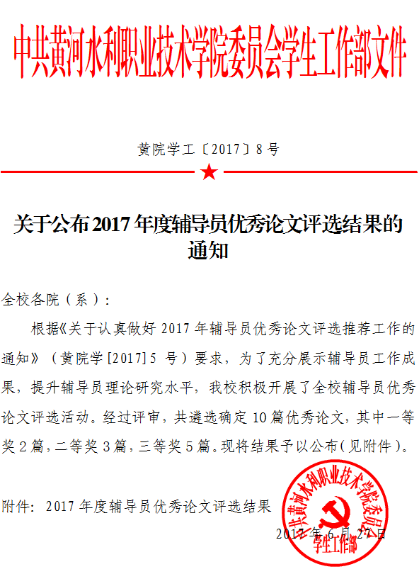 关于公布2017年度辅导员优秀论文评选结果的通知