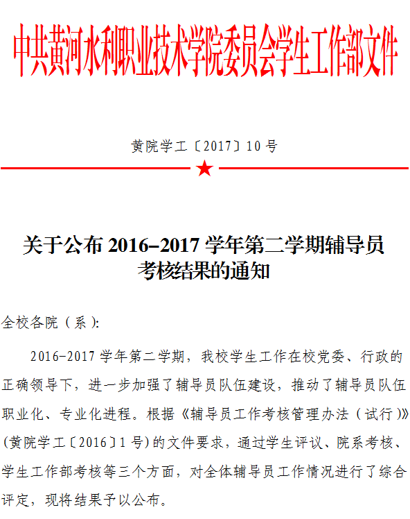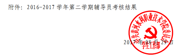 关于公布2016-2017学年第二学期辅导员考核结果的通知