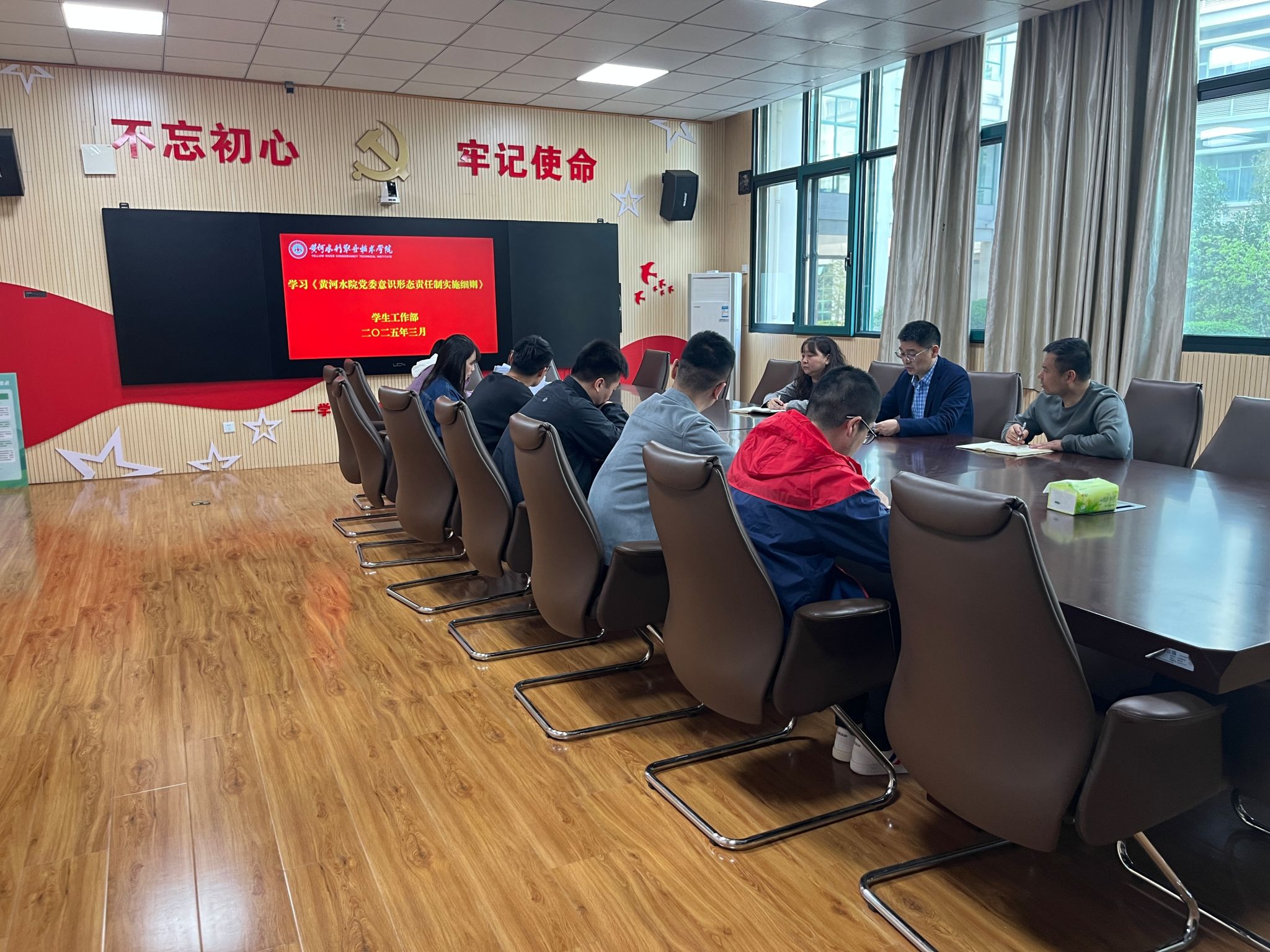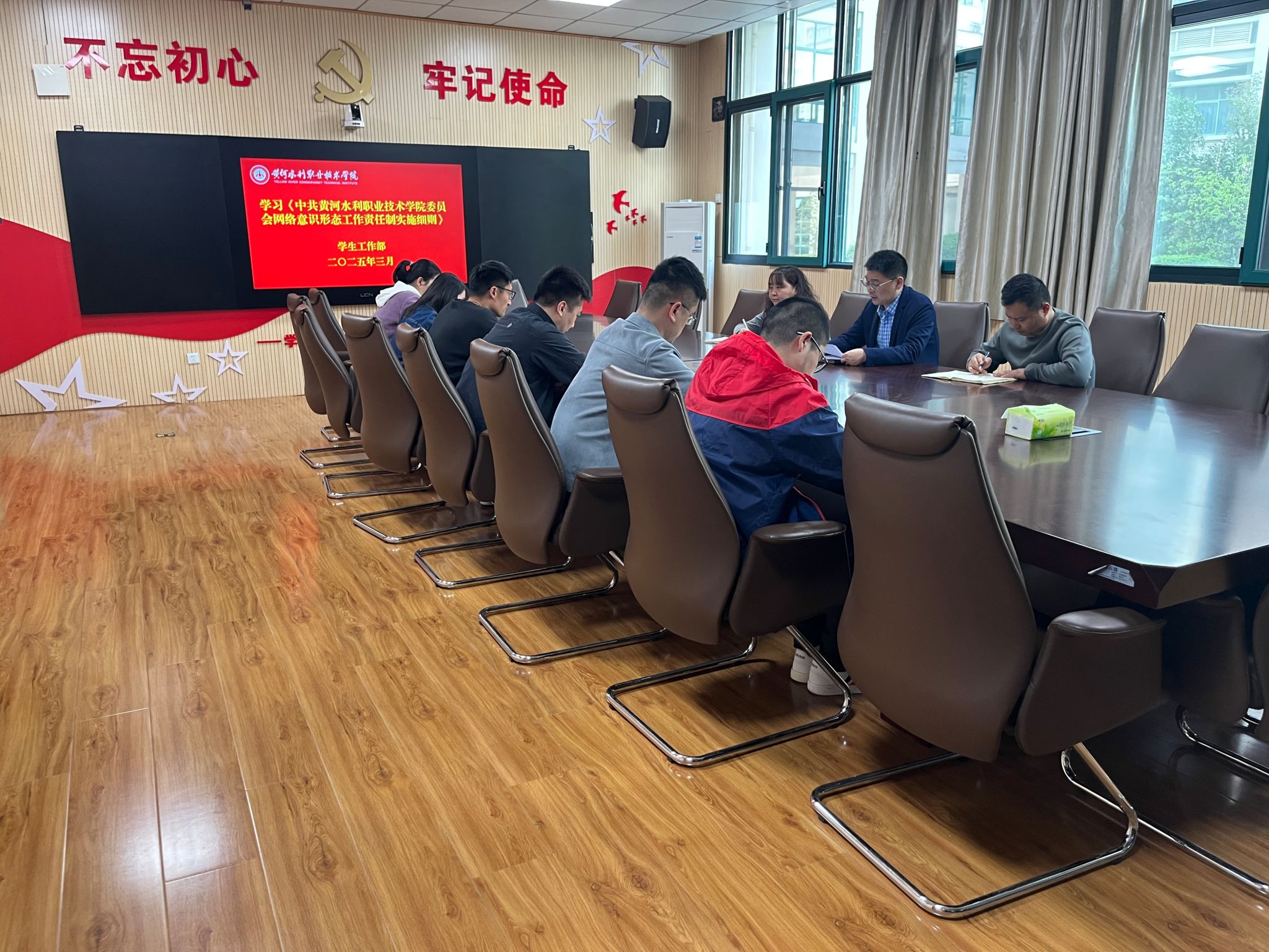 3月11日,学生工作部召开专题学习会议,全体成员深入学习《黄河水院党委意识形态责任制实施细则》《中共黄河水利职业技术学院委员会网络意识形态工作责任制实施细则》及2025年两会精神。会议由学生工作部部长商坤主持,部门全体成员参加。