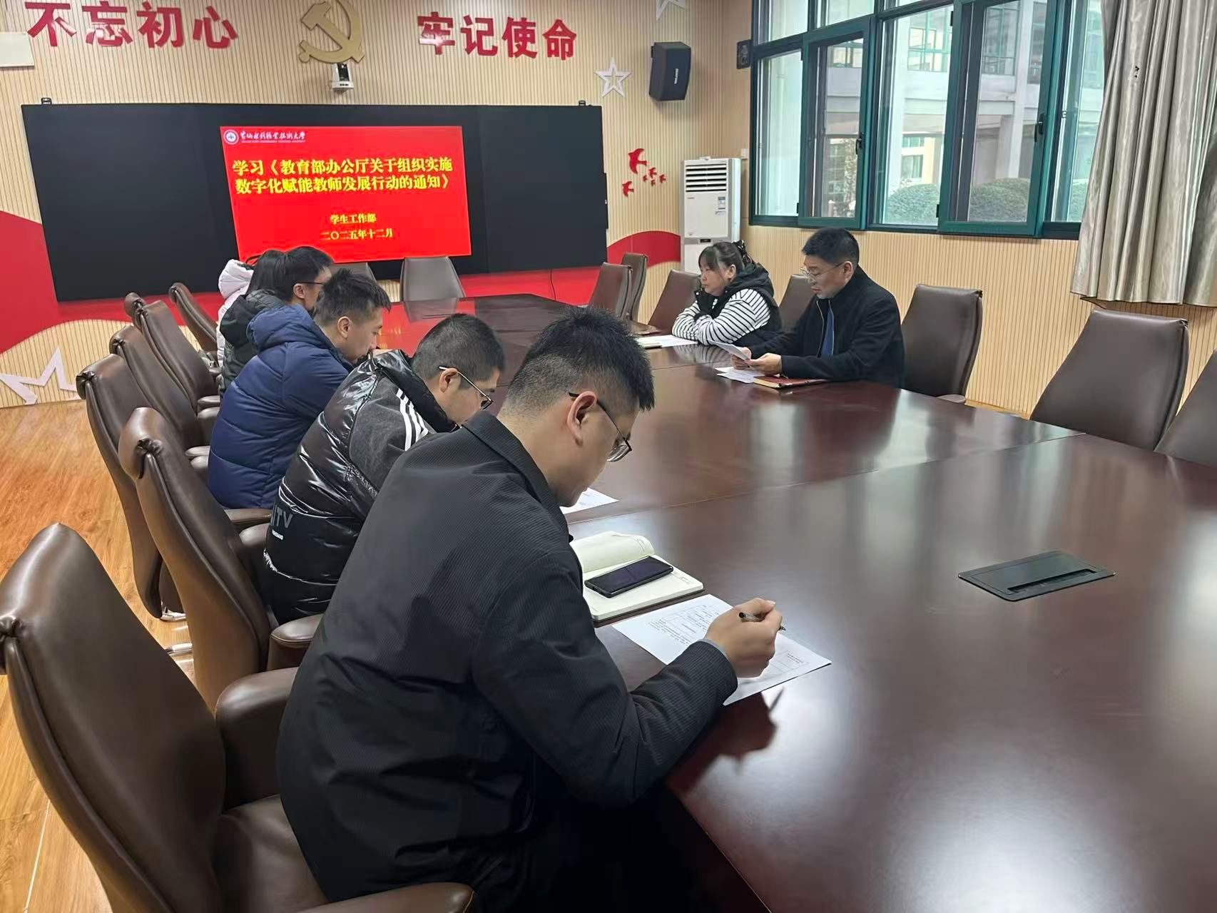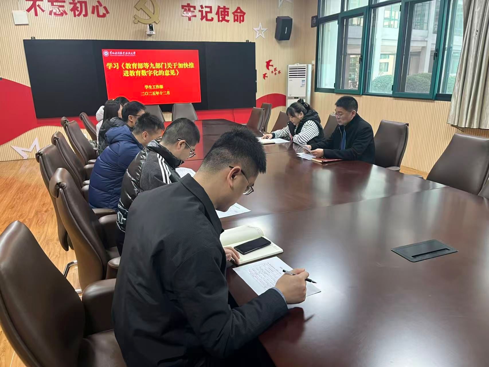 12月2日,学生工作部召开2025年下半年第六次政治理论学习专题会,此次会议聚焦《教育部等九部门关于加快推进教育数字化的意见》和《教育部办公厅关于组织实施数字化赋能教师发展行动的通知》展开深入学习研讨。会议由学生工作部部长商坤主持,部门全体成员参加,旨在深刻领会文件精神,推动学生工作与教育数字化深度融合,在新时代教育变革浪潮中展现新担当、新作为。