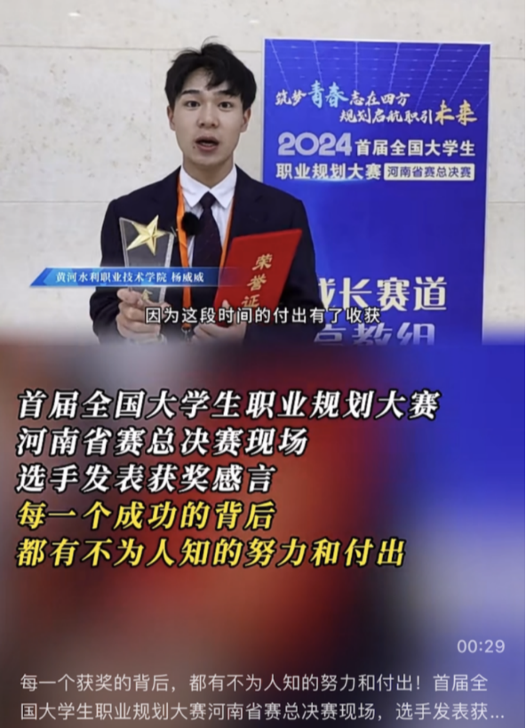 杨威威具有很强的创新精神和实践能力,在校期间参与电商专业行业赛、创新创业大赛、主持人大赛等重要赛事,并取得全国数字商业技能大赛直播营销全国一等奖、全国电子商务技能大赛全国二等奖、全国电子商务技能大赛河南省一等奖、河南省第十九届科技文化艺术节大学生主持人大赛二等奖及最佳创意奖、首届全国大学生职业规划大赛河南总决赛职教组就业赛道金奖等荣誉。