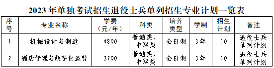 2.退役士兵考生只可报考机械设计与制造、酒店管理与数字化运营2个专业,若报考有其他专业,视为放弃退役士兵考生免文化课考试待遇,须参加相应的考试。