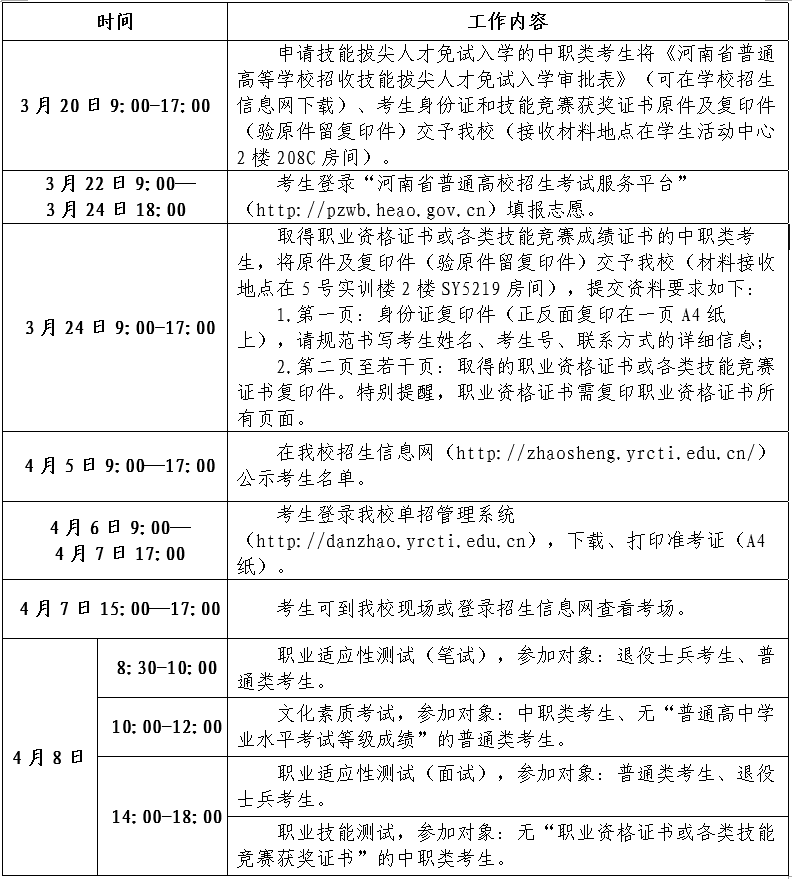 符合上述技能拔尖人才免试入学条件的考生,请于2023年3月20日9:00-17:00,由生源学校或本人将个人资料(考生身份证复印件、技能竞赛获奖证书复印件、《河南省普通高等学校招收技能拔尖人才免试入学登记表》一式三份)报送至我校(材料接收地点在学生活动中心2楼208C房间),对未按时报送上述资料的考生,视为放弃技能拔尖人才免试入学资格,按照中职类考生参加相应的考试。申请免试入学的专业,须为所获奖项的相关专业。