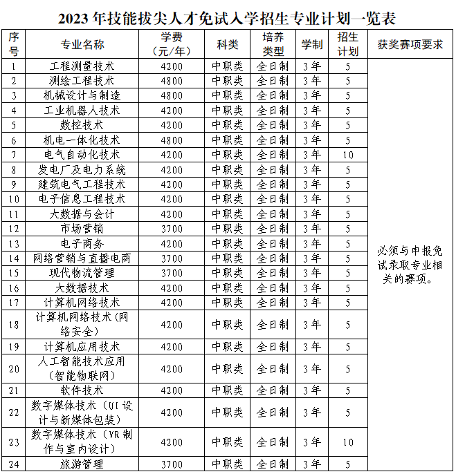 技能拔尖人才免试入学条件:获得由教育部主办或联办的全国职业院校技能大赛三等奖及以上奖项或由省级教育行政部门主办或联办的省级职业院校技能大赛一等奖的中职毕业生。