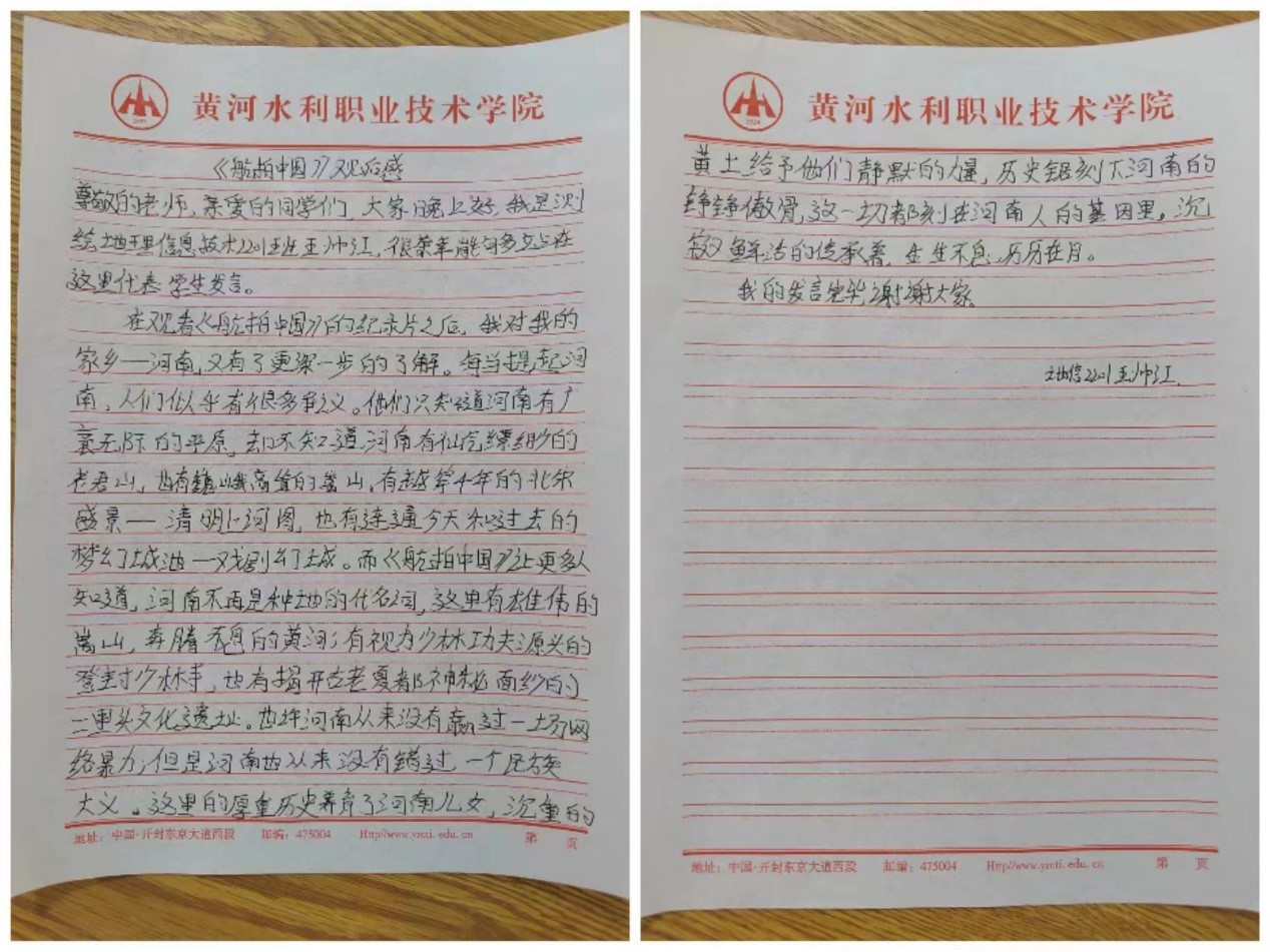 观影结束后,测绘工程学院学生代表王帅江发言表示:这里的厚重历史养育了河南儿女,沉重的黄土给予他们静默的力量,历史锯刻下河南的铮铮傲骨,这一切都刻在河南人的基因里,沉寂又鲜活的传承着,生生不息,历历在目。
