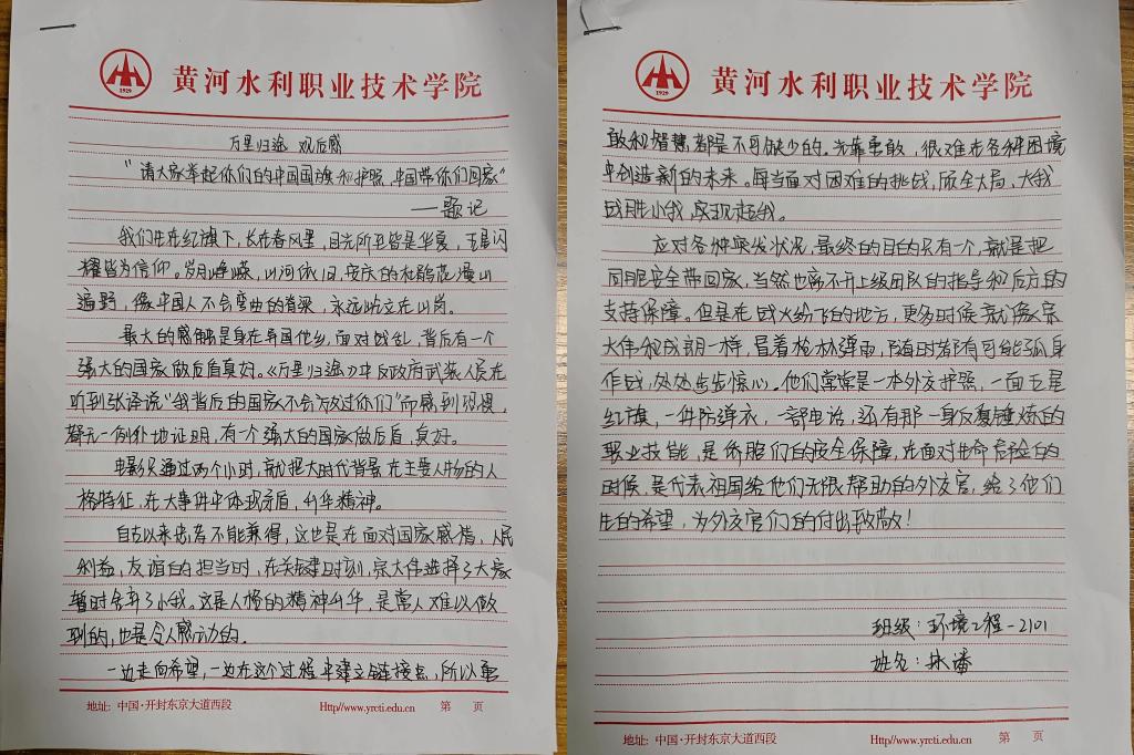 通过本次观影活动,同学们认识到了我们不是生活在一个和平的年代,而是有幸生活在一个和平的国家。我们要相信不管走到哪里,祖国不会放弃任何一个同胞,强大的祖国是我们每一个人最坚强的后盾。