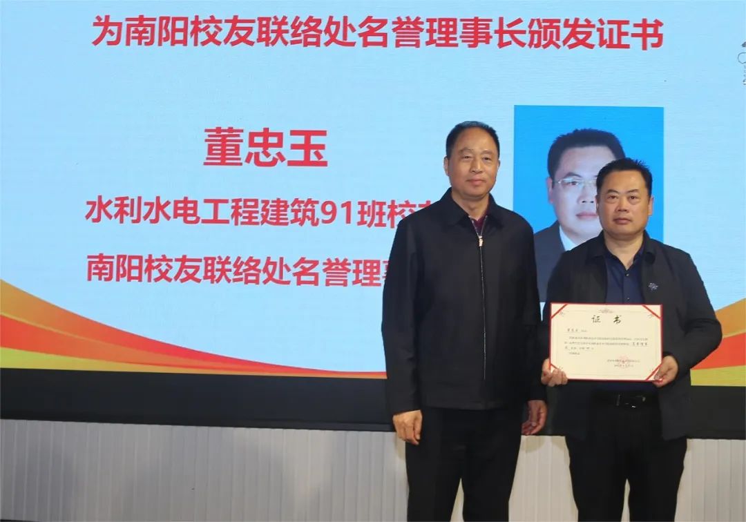 校友会会长赵国训、南阳校友联络处名誉理事长董忠玉共同为南阳校友联络处揭牌。赵国训、王卫东、李纪宾为当选的首届理事会负责人颁发聘书。