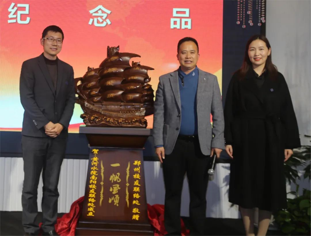黄河水院郑州校友联络处秘书长佘克超代表兄弟联络处致贺词,希望各兄弟联络处要充分发挥作用,广泛联络校友,维系珍贵情感,共助母校发展。郑州校友联络处副理事长魏鹏、靳晖代表郑州校友联络处赠送纪念品。