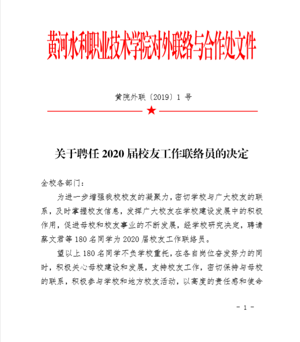 黄院外联〔2019〕1号 关于聘任2020届校友工作联络员的决定.pdf