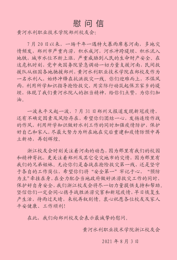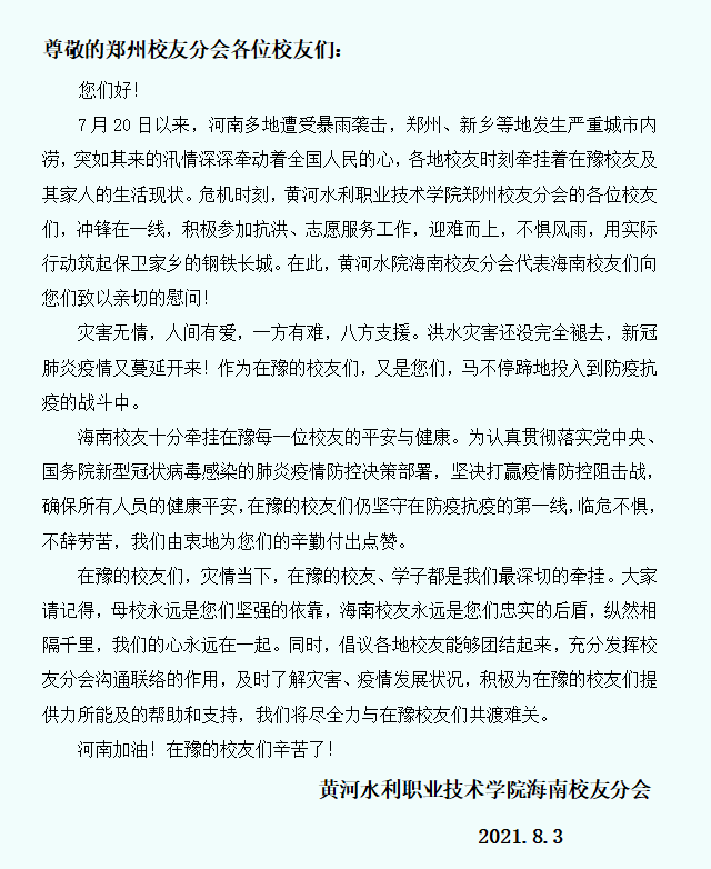 海南校友分会、浙江校友分会向河南校友发来慰问信