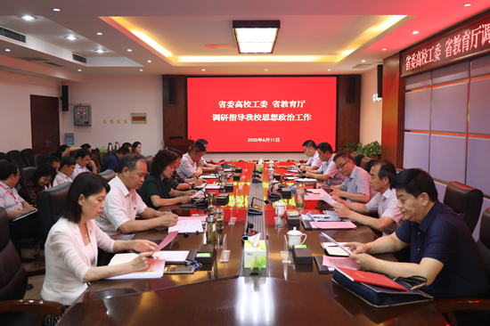 6月11日下午,以省委高校工委专职委员何秀敏为组长的省委高校工委 省教育厅调研组一行5人到我校开展高校思想政治工作专题调研。座谈会在我校行政楼第二会议室举行,全体校领导出席会议,党政办公室、党委组织部、党委宣传部、学生工作部、教务处、教师工作部、保卫部、校团委、马克思主义学院、科技处等部门负责人参会。座谈会由校党委书记周保平主持。