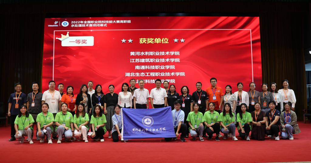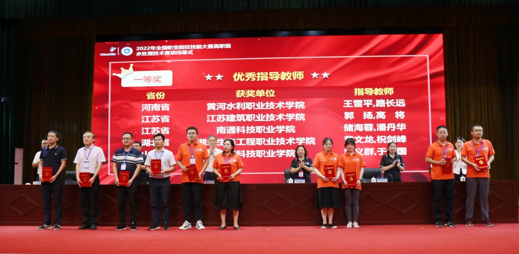 陈卫东宣布竞赛成绩。黄河水利职业技术学院、江苏建筑职业技术学院、南通科技职业学院、湖北生态工程职业技术学院、山东科技职业学院等5个代表队荣获一等奖。河北工业职业技术大学、杨凌职业技术学院、浙江同济科技职业学院、广东环境保护工程职业学院、广西水利电力职业技术学院、重庆水利电力职业技术学院、北京电子科技职业学院、杭州职业技术学院、天津渤海职业技术学院、安徽水利水电职业技术学院等10个代表队荣获二等奖。福建水利电力职业技术学院、重庆工程职业技术学院、湖南水利水电职业技术学院、江西环境工程职业学院、福建农业职业技术学院、兰州资环大学、湖南化工职业技术学院、神木职业技术学院、威海海洋职业学院、贵州工业职业技术学院、辽宁省交通高等专科学校、贵州水利水电职业技术学院、湖北工业职业技术学院、广西生态工程职业技术学院、广东水利电力职业技术学院等15个代表队荣获三等奖。获得一等奖的代表队指导老师获评优秀指导教师。与会领导分别为获奖选手和优秀指导教师颁奖。