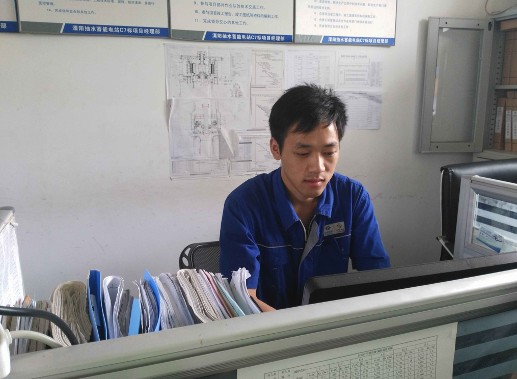 工作服上带点柴油的肖明,2012年毕业于黄河水利职业技术学院水电站动力设备与管理专业,2013年7月调配到溧阳机电安装项目部负责机组水轮机安装技术管理工作。他不是整天“宅”在办公室,而是每天挎着装满图纸的工具包,穿梭在厂房每台机组安装现场的大小角落,主动深入现场指导技术、解决问题。身体高瘦,穿着工作服,头发被安全帽压成碗状,这就是和工人打成一片的肖明。由于每天接触着带有柴油的设备,工作服上时常会出现一坨坨被柴油侵蚀的地方,这样的工作服也是水轮机工人的标志。