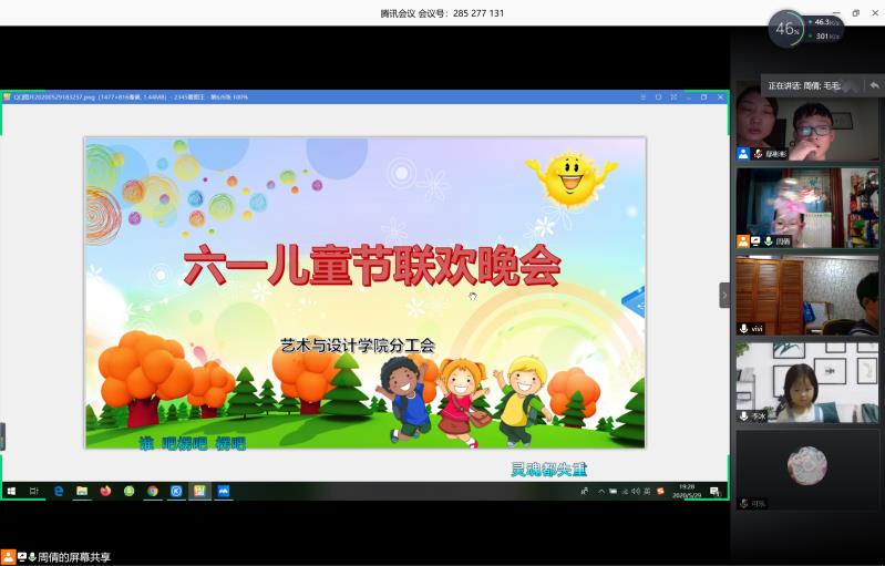 艺术与设计学院分工会为庆祝“六一”儿童节活动,于2020年5月29日晚在腾讯会议上举办了一次别开生面的联欢晚会。晚会由赵怡辰小朋友主持,孩子们在家长的带领指导下踊跃参加。晚会节目异彩纷呈,种类繁多,有古诗朗诵,歌曲《劳动最光荣》,舞蹈《我是一颗跳跳糖》,钢琴演奏《玩具》《沙漠骆驼》等等。孩子们多才多艺,在线上贡献了一场视觉盛宴,活动取得了圆满成功。节日当天,院领导发放了儿童节小礼品。艺术与设计学院分工会通过组织此次线上庆六一活动,使孩子们度过了一个难忘快乐又有意义的儿童节。