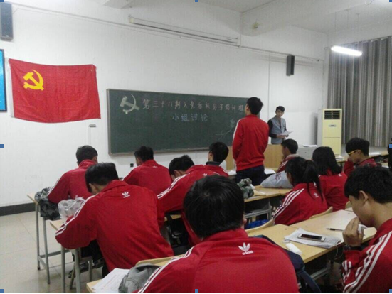 2015年10月4日晚八点艺术系第三十八期入党学员在教学楼7506开展党课小组讨论活动。此次活动参加人员有组织部负责人韩杏汶、刘明辉以及第38期入党学员。