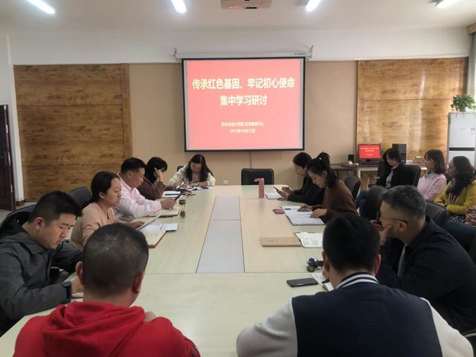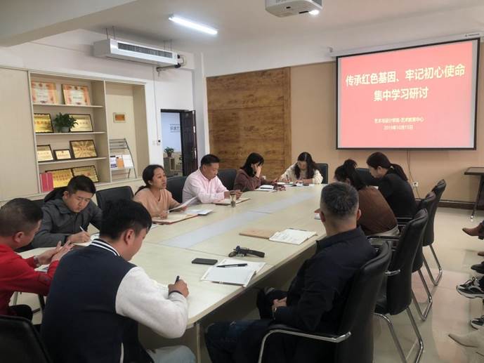 2019年10月15日下午2点30分,艺术与设计学院在会议室SY5616召开全体教职工大会,按照主题教育活动方案,开展“传承红色基因、牢记初心使命”集中学习研讨,院党总支书记耿亚杰主持学习活动。