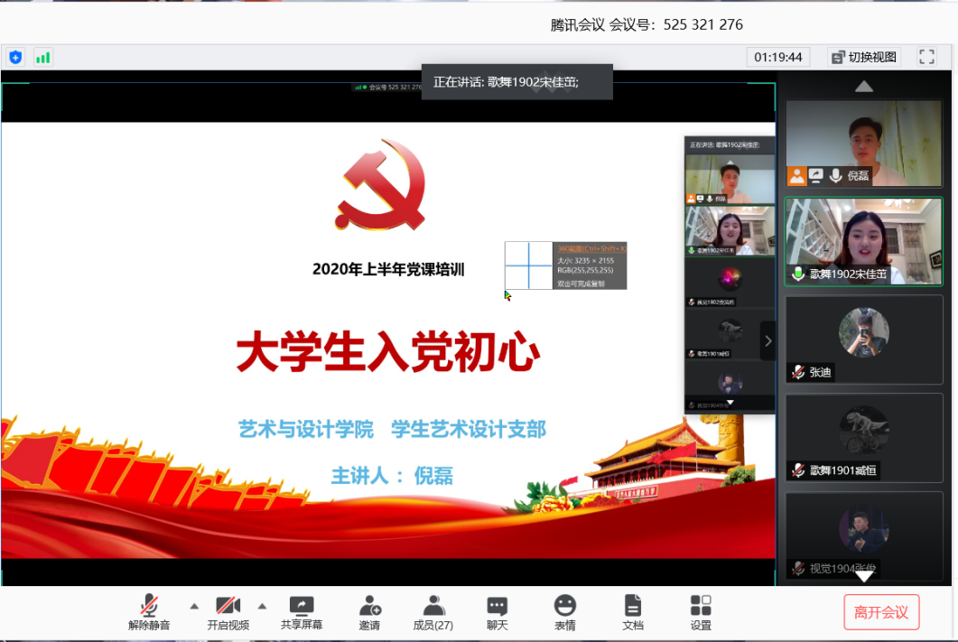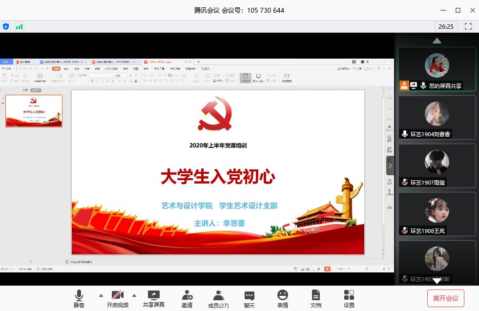 为深入学习贯彻党的十九大精神和习近平新时代中国特色社会主义思想,进一步认识“不忘初心、牢记使命”的深刻内涵,5月11日晚,艺术与设计学院学生艺术设计支部组织2020年上半年党校学员围绕“大学生入党初心”“我的入党记忆”等主题开展网上交流研讨活动。支部书记张嫚、组织委员李思荟和宣传委员倪磊通过腾讯会议分别组织开展本次研讨。