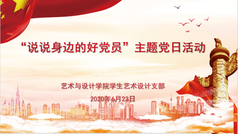 为庆祝中国共产党建党99周年,持续巩固和深化“不忘初心、牢记使命”主题教育成果,激励全校基层党组织和广大党员充分发挥战斗堡垒和先锋模范作用,艺术与设计学院学生艺术支部于2020年6月23日在SY5616会议室开展了“说说身边好党员”主题党日活动。本次党日活动线上线下同步举行。院党总支副书记赵巍、学生艺术支部书记张嫚、组织委员李思荟、宣传委员倪磊及支部全体学生党员参加了本次活动。学生艺术设计支部党员先后发言,对一年来支部所涌现出来的先进人物和先进事迹进行讲述。