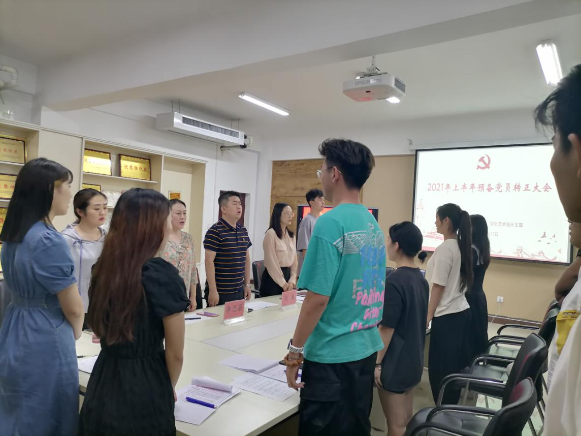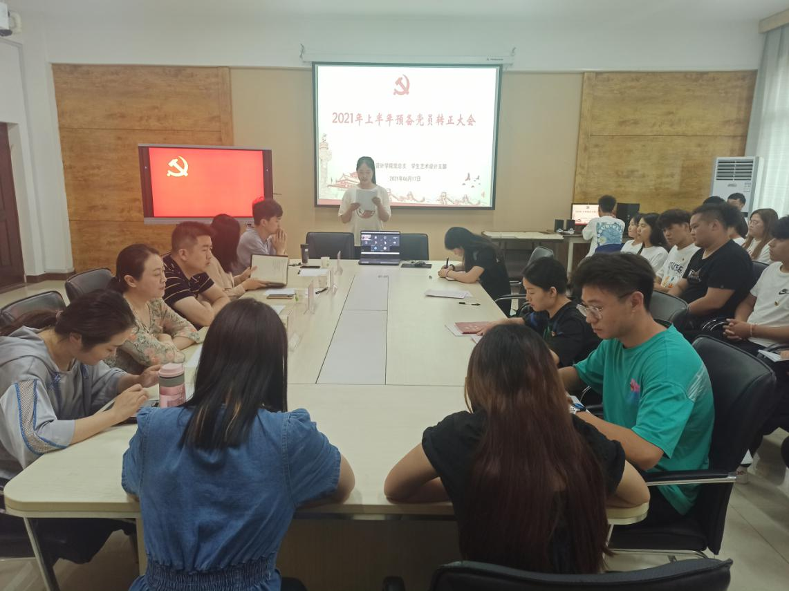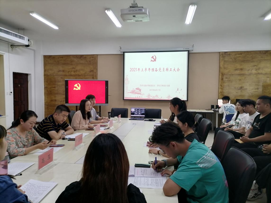 6月17日下午4点,艺术与设计学院学生艺术设计支部在实训楼SY5616会议室召开2021年上半年预备党员转正大会。本次大会由学生艺术设计支部书记张嫚主持,支部全体党员师生及2021年上半年新发展党员参加,参会党员人数符合相关规定。