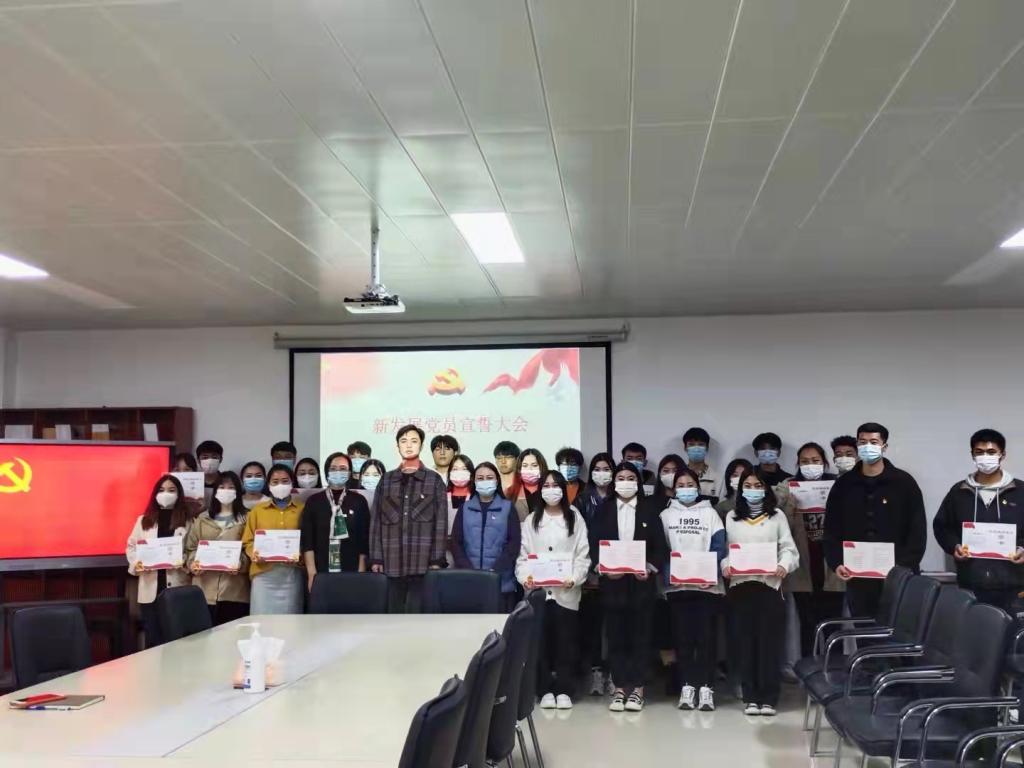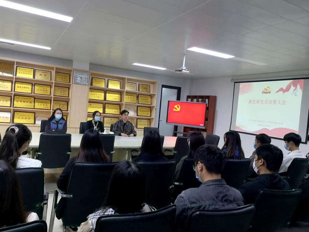 会议中,支部宣传委员倪磊老师带领新发展党员张迪、宋佳茁、赵玎玎等30名同志在鲜红的党旗下庄严宣誓,随着一字一句宣誓词的道出,让他们更加坚定永远跟党走的信心与决心。支部组织委员李思荟老师向新发展党员表示祝贺,她希望大家进一步深入学习党的基本理论和基础知识,不断提高自身思想政治素质,努力改正缺点,积极向上,不负韶华。随后,支部委员共同为新发展党员颁发党员政治生日贺卡。
