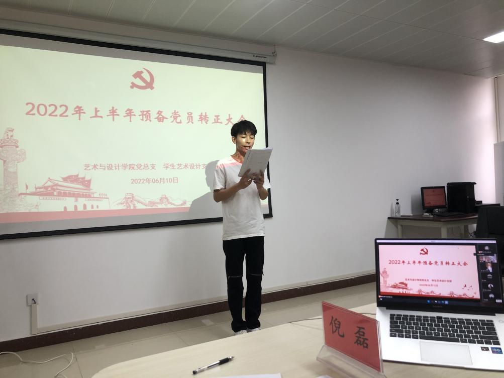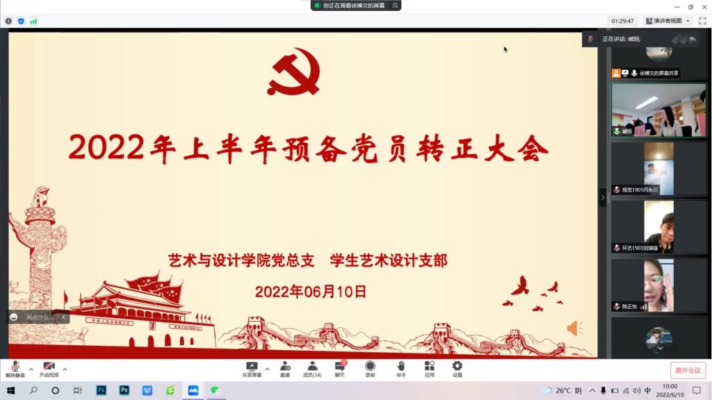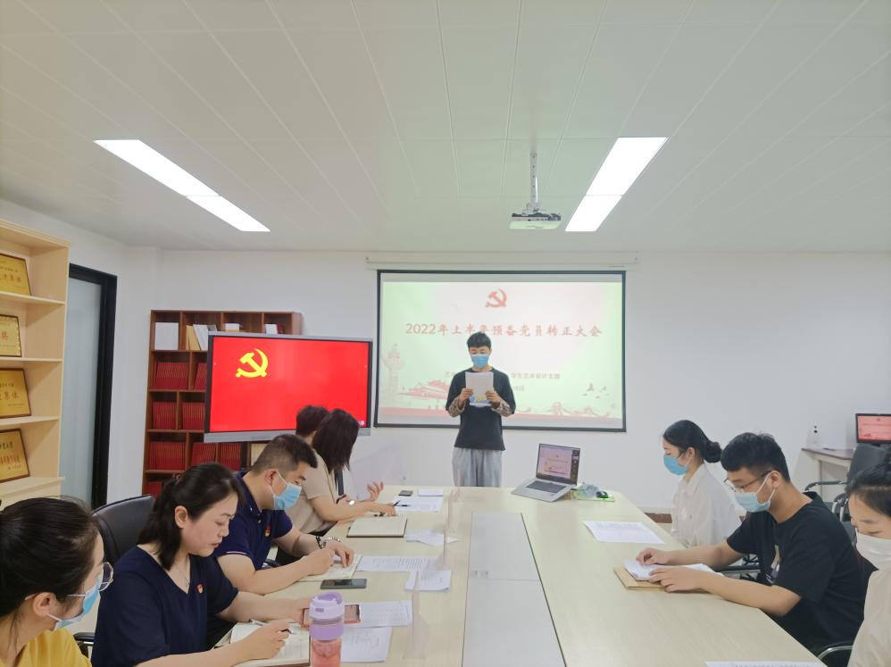 6月10日下午3点,学生艺术设计支部在实训楼SY5516会议室结合线上腾讯会议召开2022年上半年预备党员转正大会。本次大会由学生艺术设计支部书记张嫚主持,支部全体党员师生及2022年上半年新发展党员参加,参会党员人数符合相关规定。