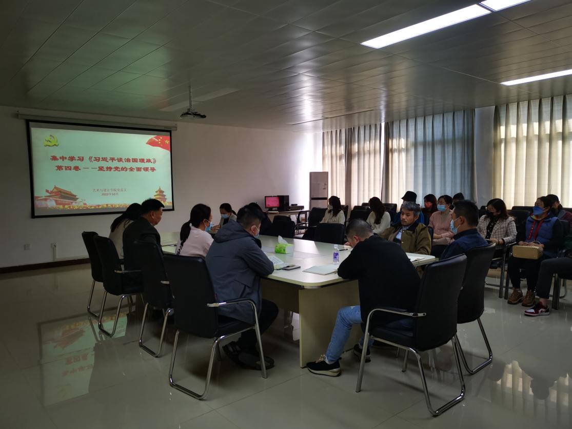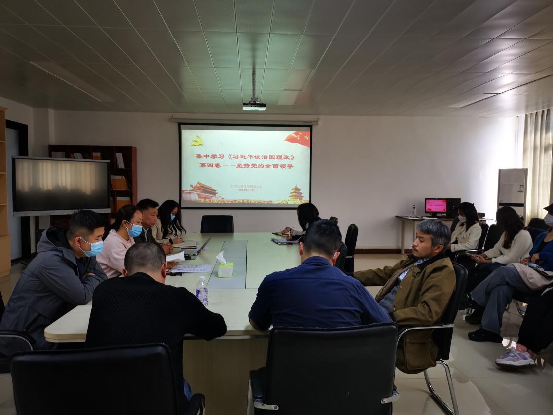 10月11日下午,艺术与设计学院组织教职工集中开展政治理论学习,围绕《习近平谈治国理政》第四卷第二专题“坚持党的全面领导”开展学习与交流,党总支书记耿亚杰领学。