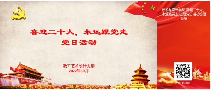 为庆祝党的二十大胜利召开,进一步引导教师深刻领会和把握党的二十大精神实质和丰富内涵,切实把行动和思想统一到党的二十大精神上来,把力量凝聚到党的二十大确定的各项任务上来,真正检验学习党的二十大精神的成果。教工艺术设计支部于10月23日至10月28日组织开展“喜迎二十大,永远跟党走”知识学习及答题主题党日活动。按照疫情防控要求,活动采用线上方式进行。