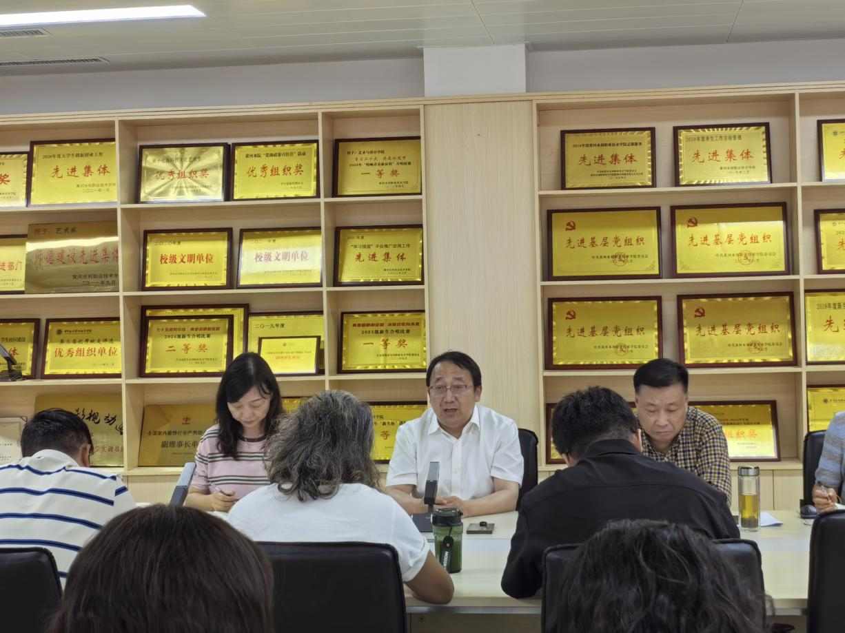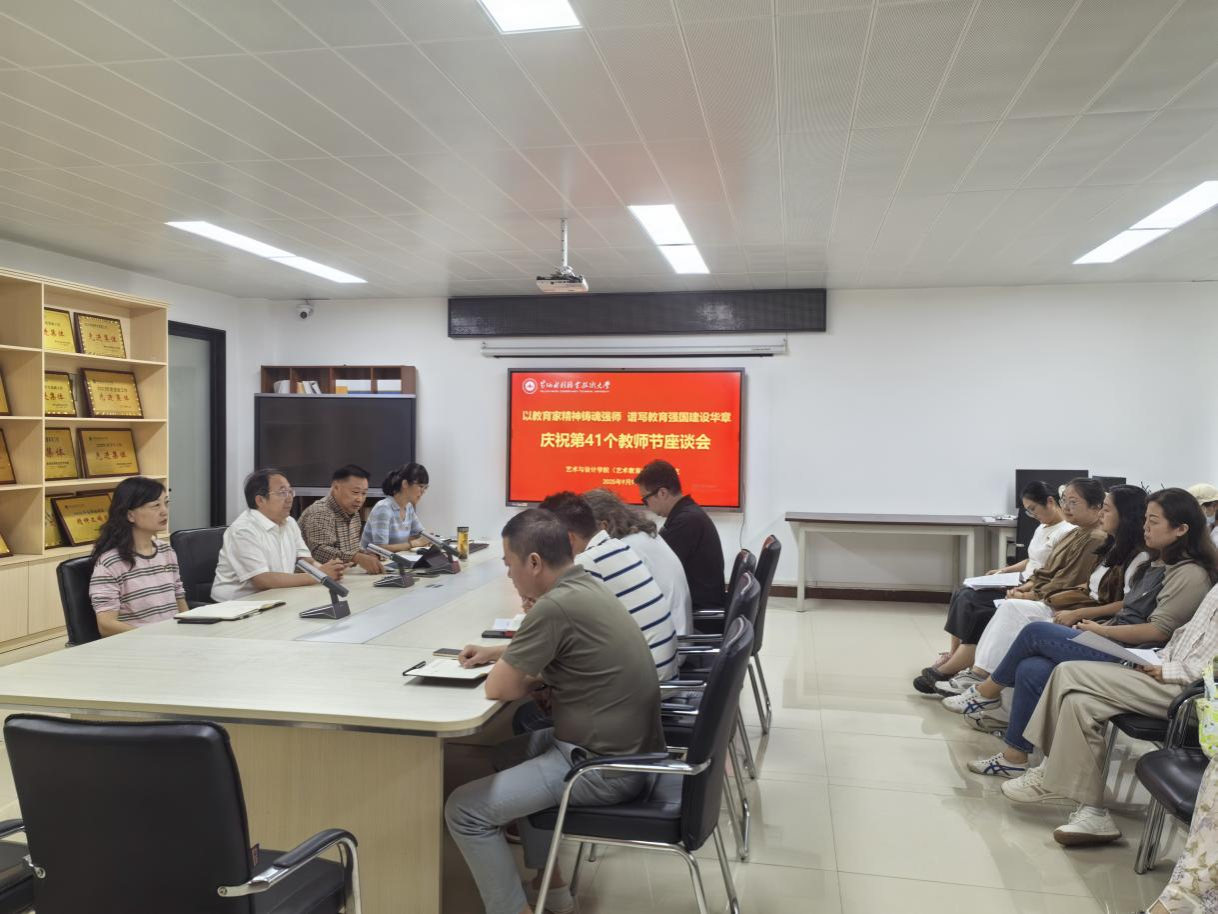 为迎接第41个教师节的,大力弘扬教育家精神,担当为党育人,为国育才使命,9月9日下午15时,艺术与设计学院(艺术教育中心)教工艺术设计支部召开了“以教育家精神铸魂强师,谱写教育强国建设华章”为主题的教师座谈会和“躬耕教坛 强国有我”主题党日活动。副校长周志琦莅临参加,会议由教工艺术设计支部书记李娅主持。
