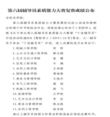按照《关于举办第六届辅导员素质能力大赛暨“十佳辅导员”评选活动的通知》[黄院学工(2019)10号]要求,我院积极组织辅导员参加学校第六届辅导员素质能力大赛,初赛经过笔试和“十个一”平台检查两个环节的综合评定,复赛经过谈心谈话和案例分析两个环节的综合评定,最终我院张嫚和李辰两位老师进入决赛,并角逐“十佳辅导员”评选。