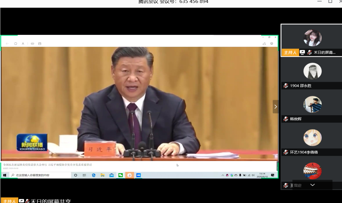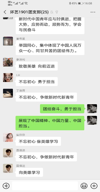 线上学习期间学生们观看了表彰大会新闻及视频,学习了习近平总书记的讲话后,分别就疫情期间大家各自的感受进行自主发言,大家表示对于四位国家英雄报以崇高的敬意,面对突如其来的严重疫情,在抗击疫情期间无私奉献的医护人员表示深深的感谢。作为高校师生,更应该学习他们这种舍生忘死的精神,为祖国伟大复兴贡献力量!